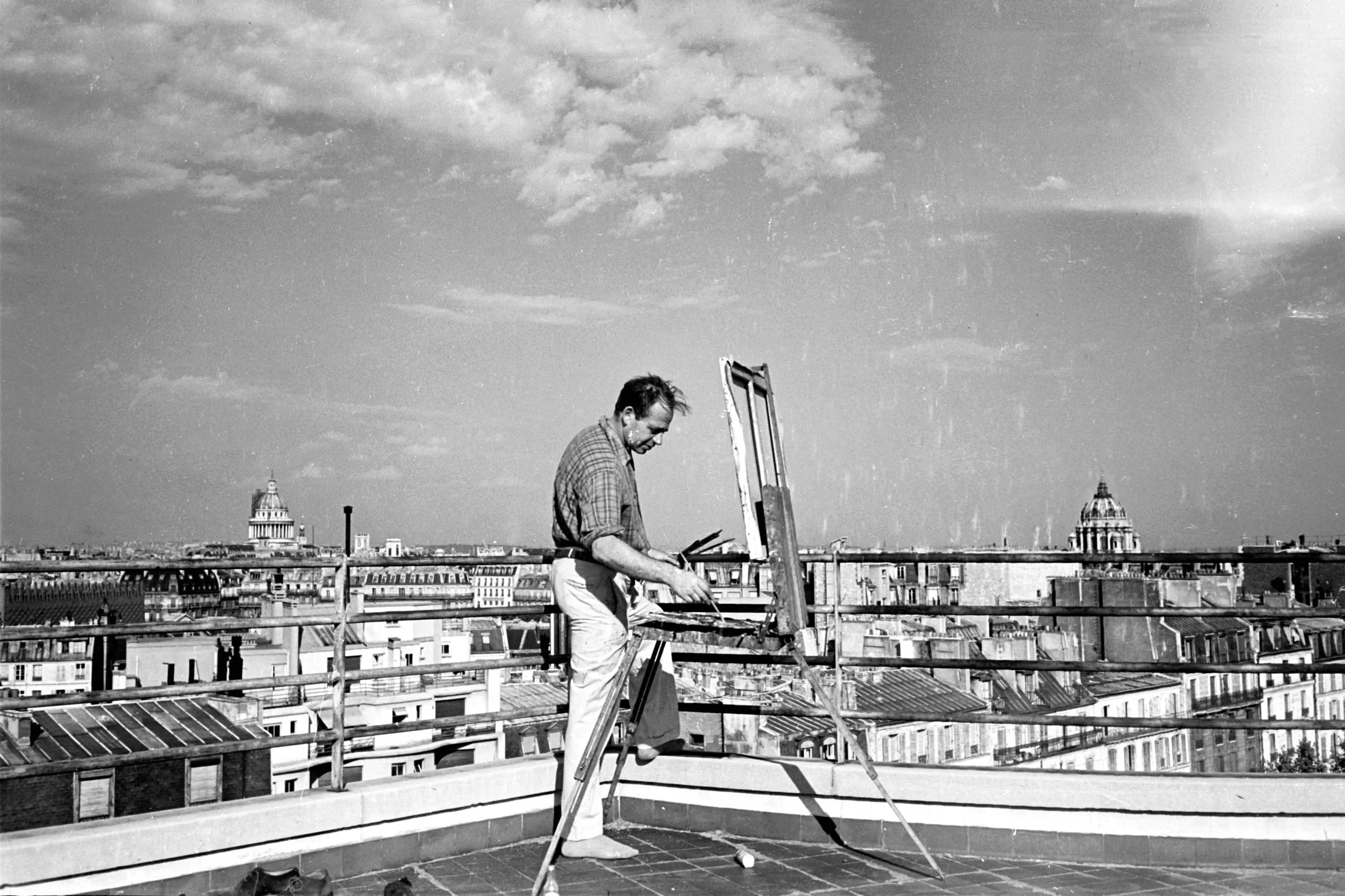 Black and white photograph of a man in a plaid shirt painting at an easel on a rooftop, with a city skyline and domed buildings behind him