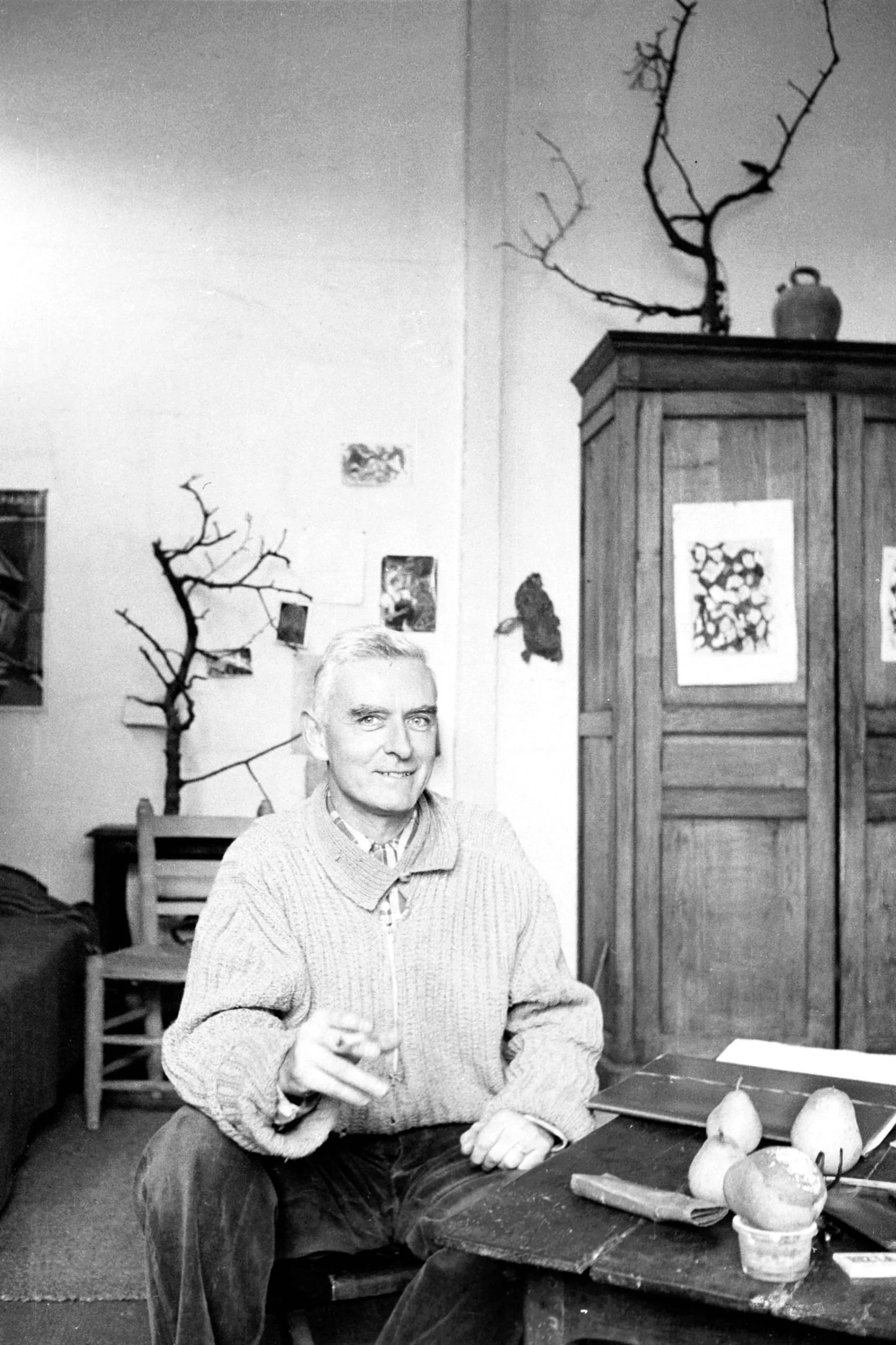 Black and white photograph of a white man with short gray hair seated in a studio, wearing a knit sweater and holding a cigarette, surrounded by bare branches, pinned drawings, and gourd-shaped objects on a low table