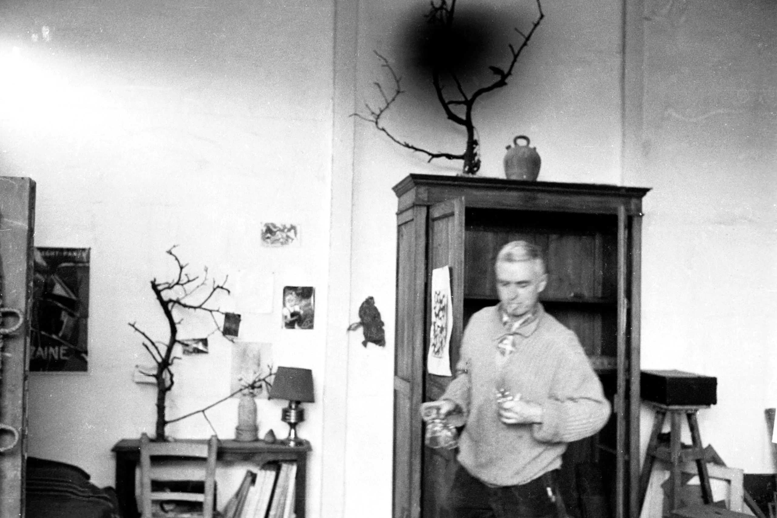 Black and white photograph of a gray-haired man in a knitted sweater standing in a cluttered artist's studio, slightly blurred from motion, holding a small object