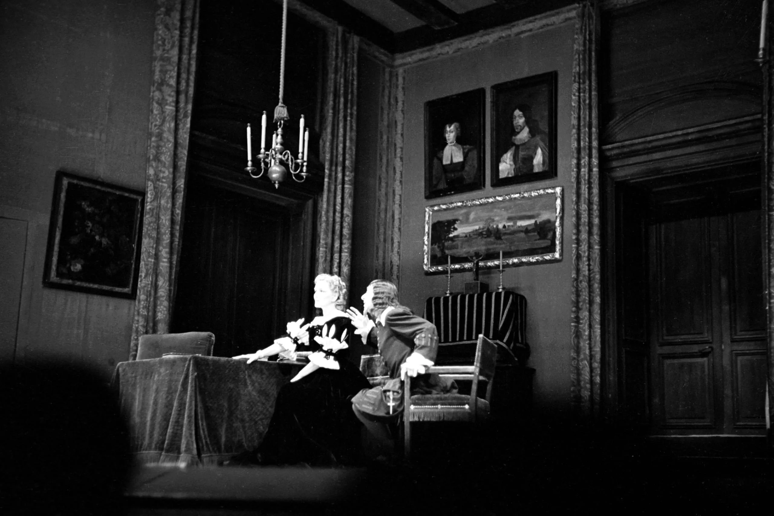 Black and white photograph of two people seated in a dimly lit, wood-paneled room hung with old-master portraits, strongly lit against deep shadows