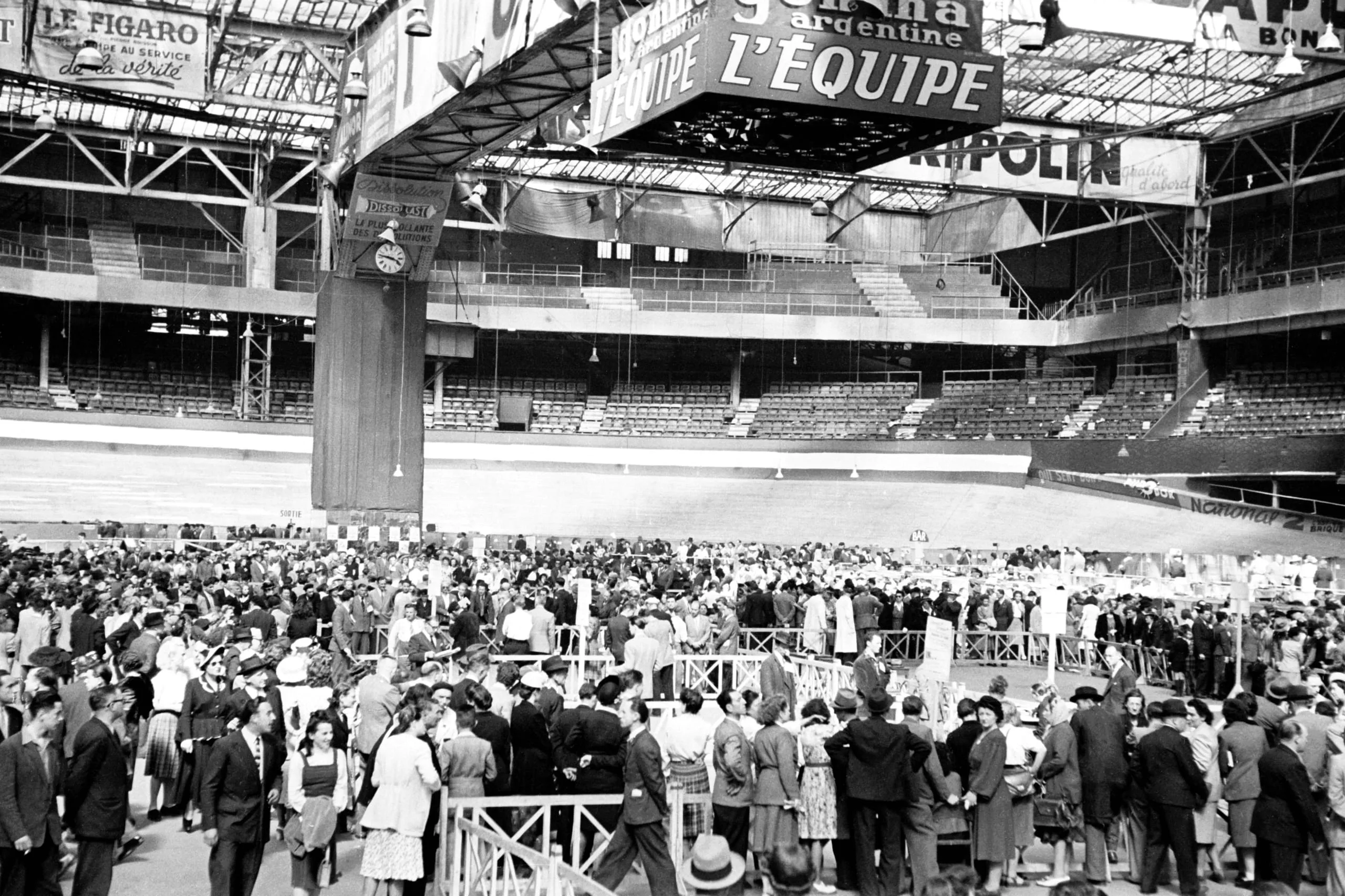Black and white photograph of a crowded indoor velodrome floor with empty tiered seating behind and French advertising banners hanging overhead, mid-twentieth century