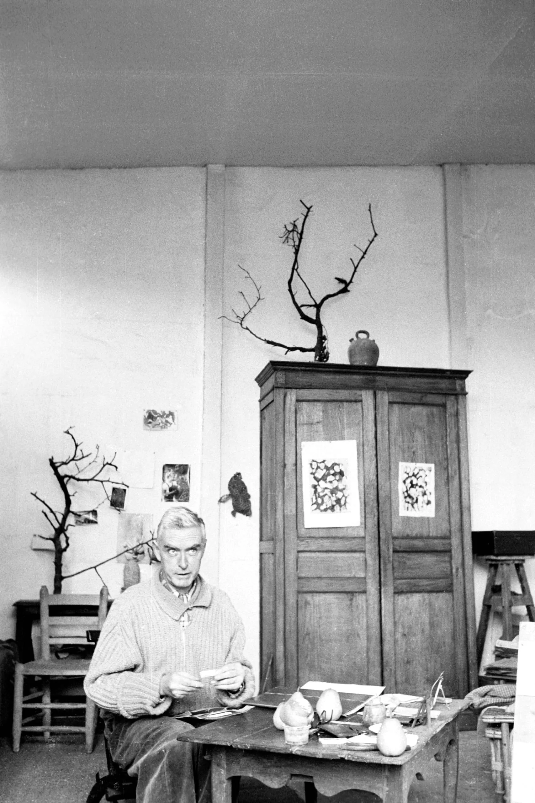 Black and white photograph of an older man seated at a worktable in an artist's studio, holding a small card, with a wooden cabinet and bare branching forms behind him