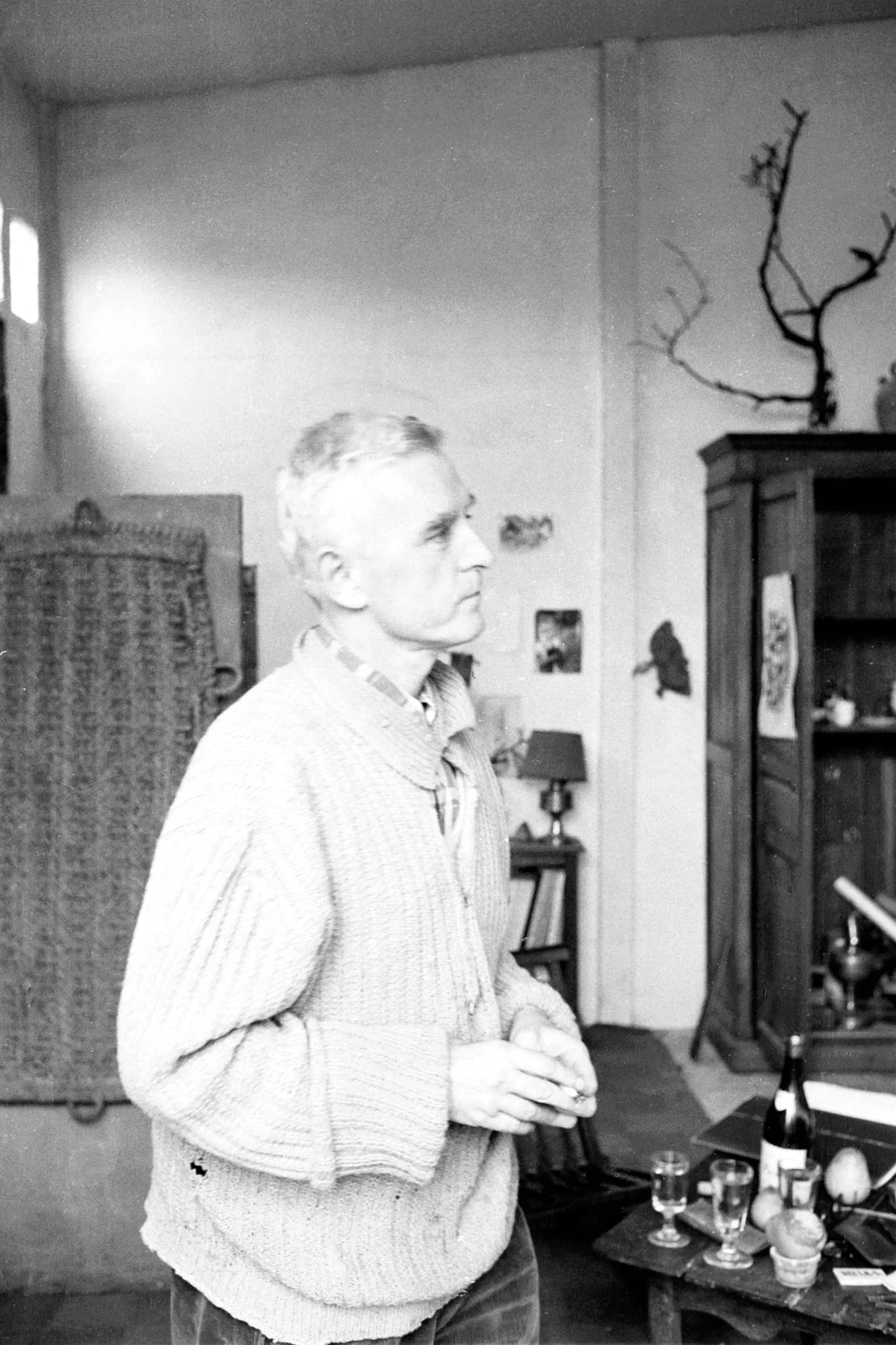 Black and white photograph of a white man in a knit cardigan, shown from the hips up in profile, standing in an artist's studio