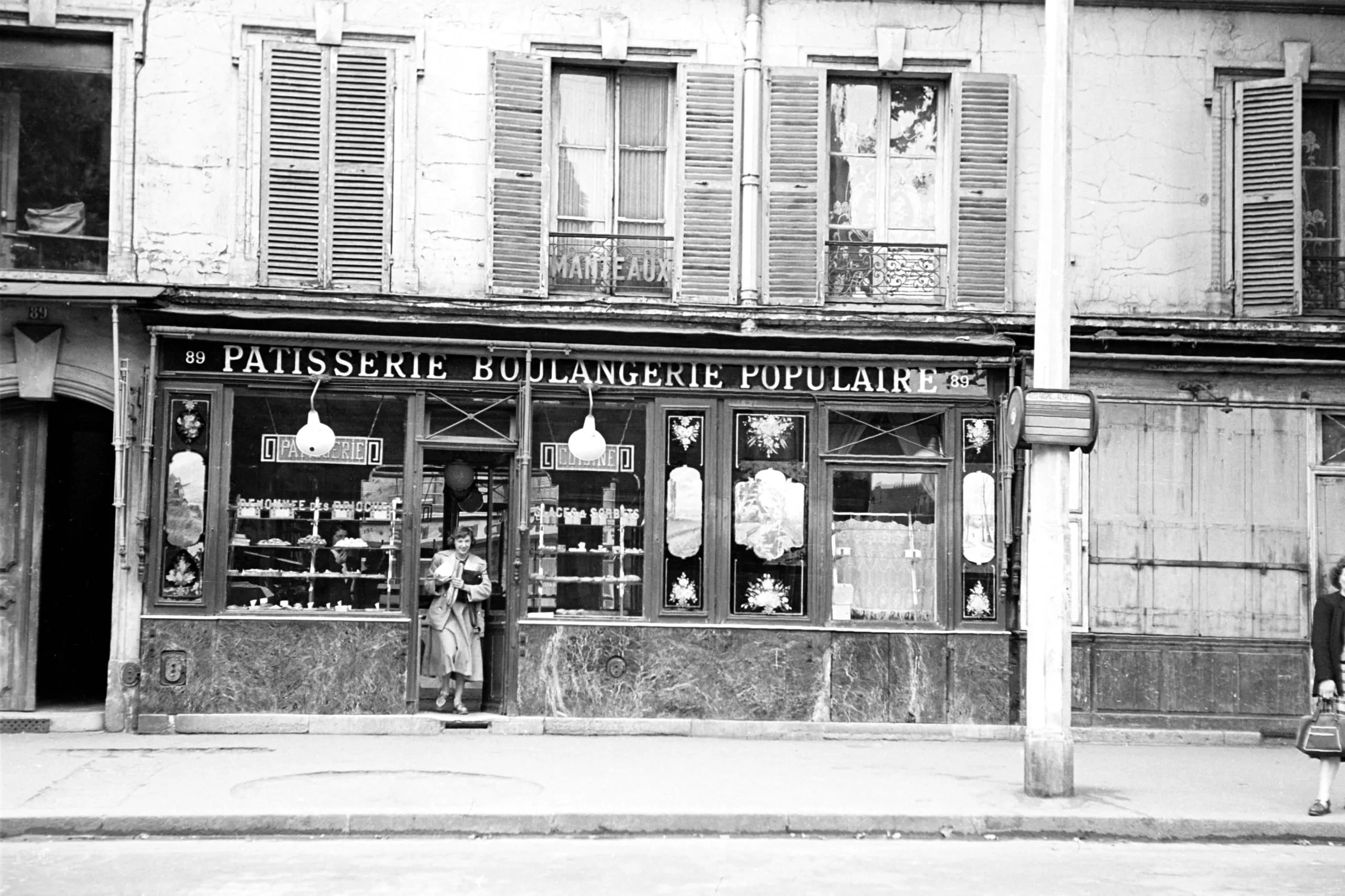 Black and white photograph of a French patisserie and boulangerie storefront with globe pendant lights, display windows, and a woman standing at the entrance