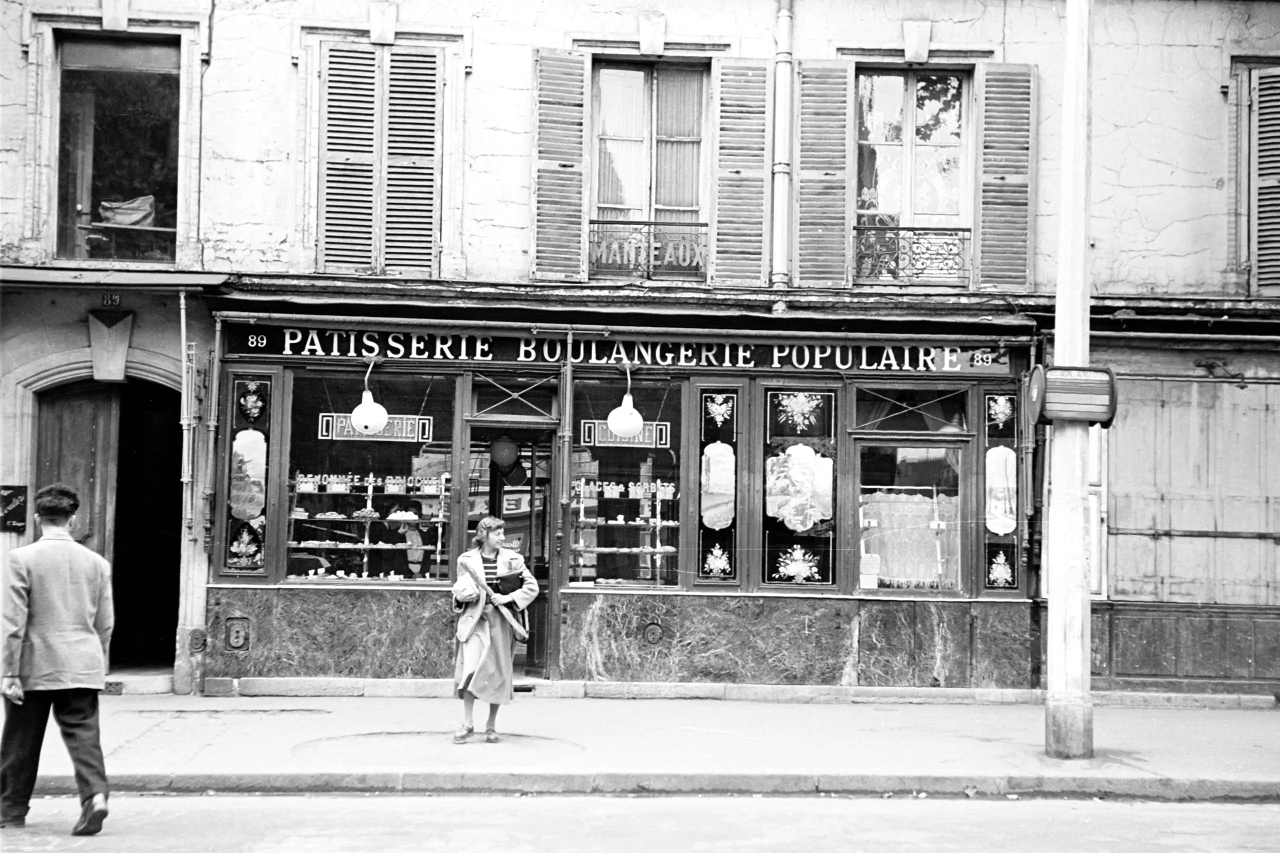 Black and white photograph of a Parisian bakery storefront reading 'Patisserie Boulangerie Populaire,' with two pedestrians on the sidewalk and shuttered windows above
