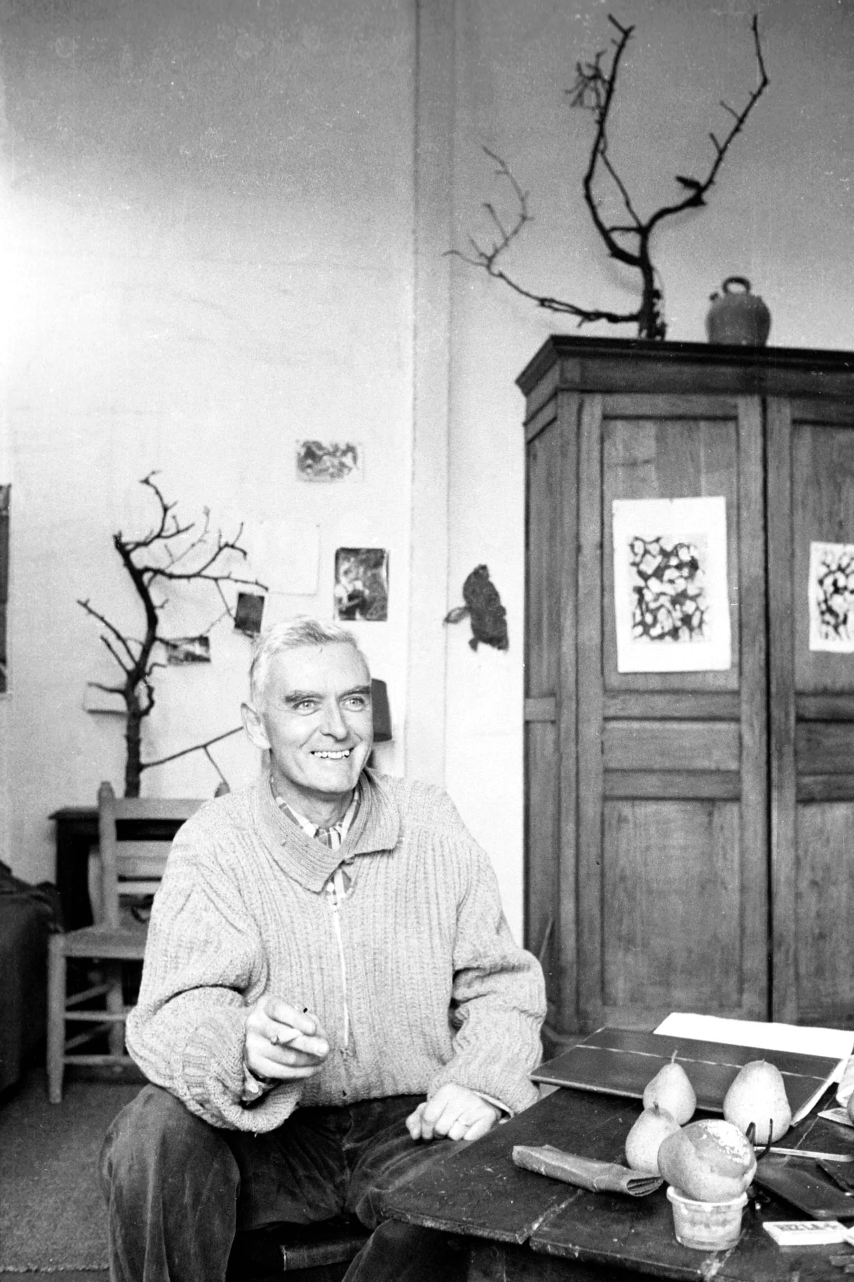 Black and white photograph of a smiling older white man seated in an artist's studio, wearing a cable-knit sweater, surrounded by pinned prints and bare branches