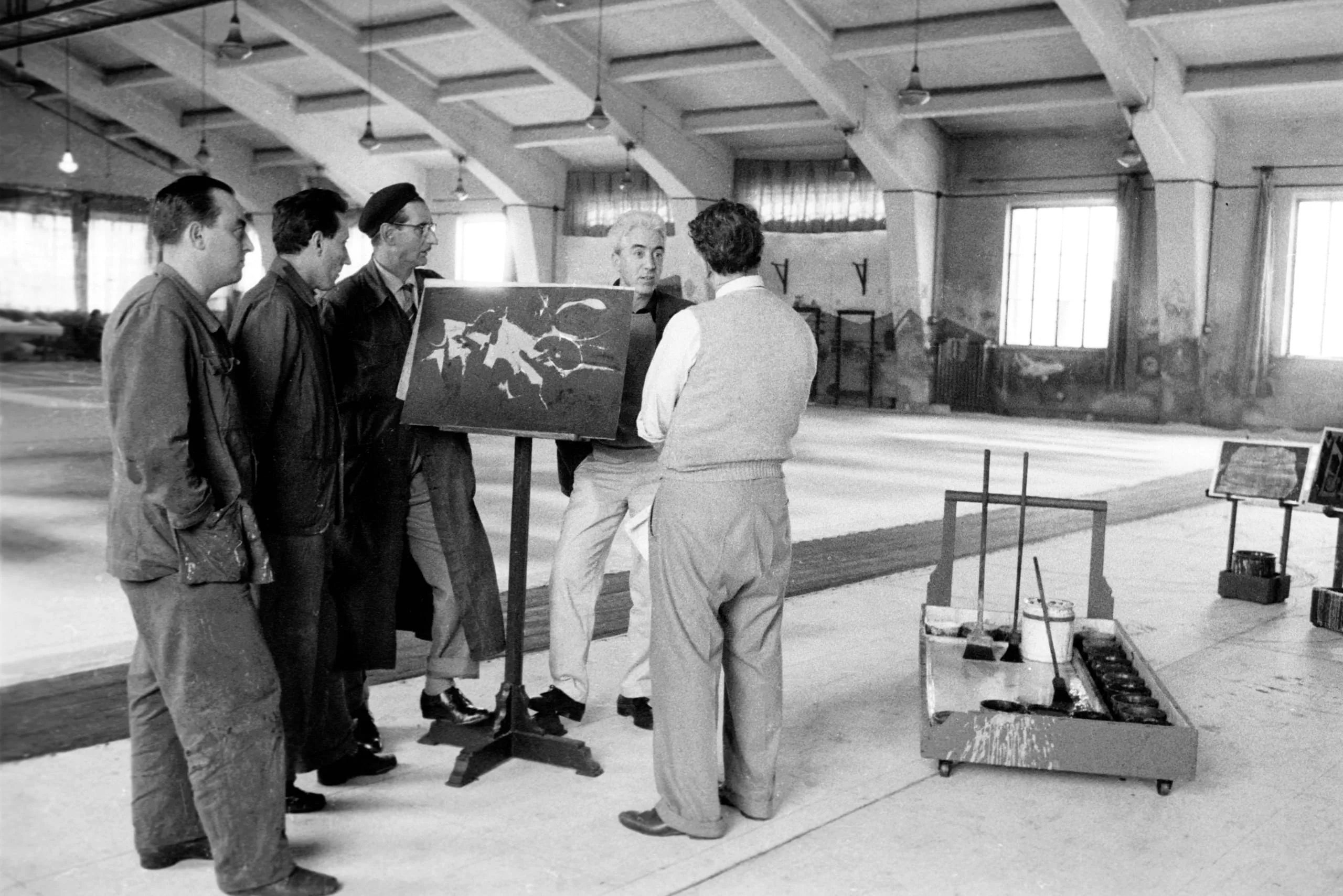 Black and white photograph of five men in a large studio space gathered around an abstract painting on an easel, with art supplies on a wheeled cart nearby