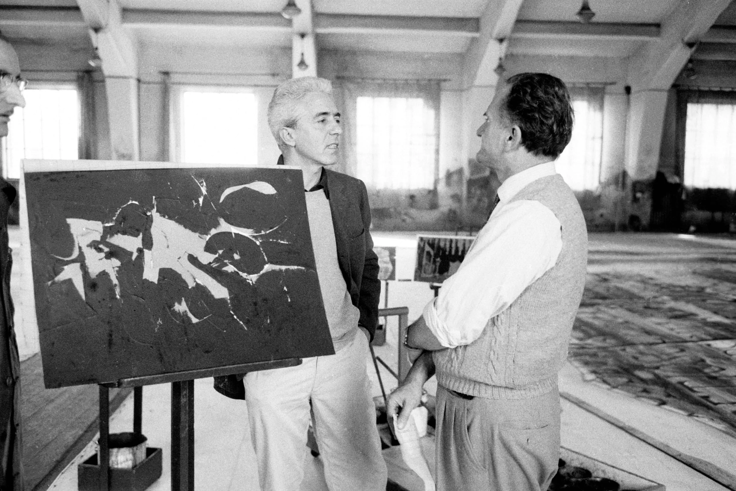 Black and white photograph of two men in a large studio space, conversing beside an easel holding a gestural abstract painting in black and white