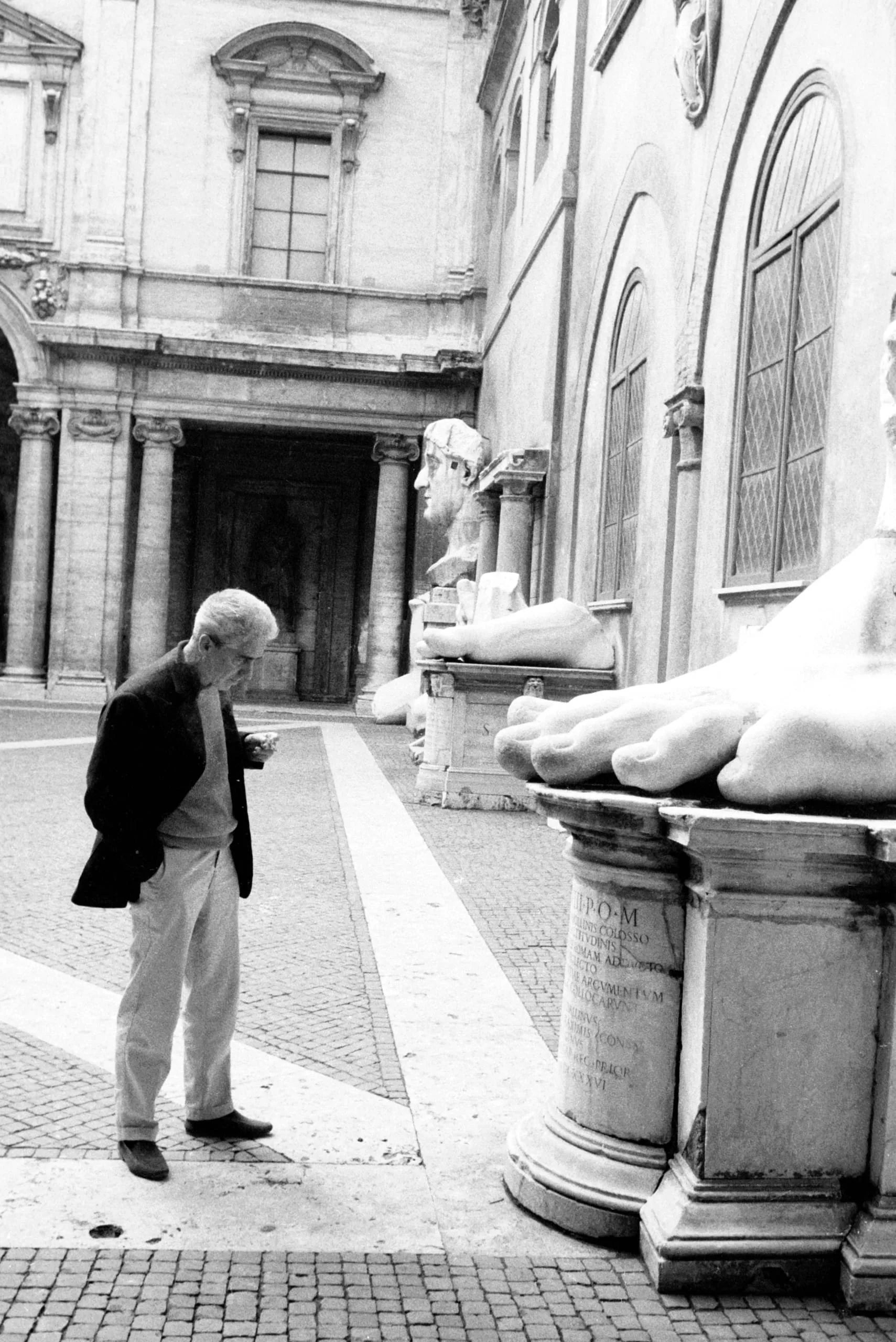 Black and white photograph of a white-haired man in a dark blazer examining something in his hand beside colossal marble sculptural fragments in a classical courtyard