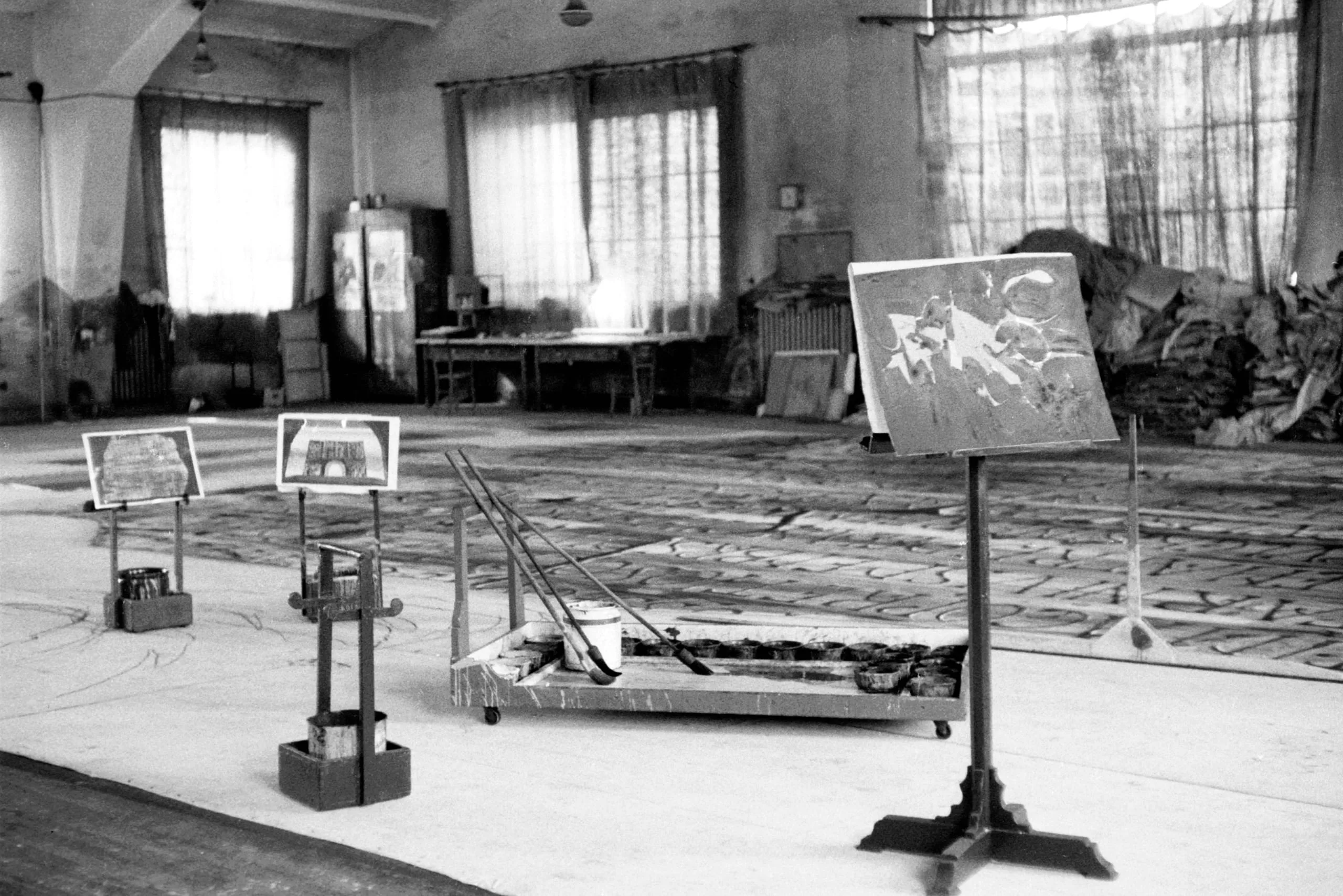 Black and white photograph of a large artist's studio interior with paint-marked floor canvas, three easels holding works in progress, and a wheeled supply cart in the foreground
