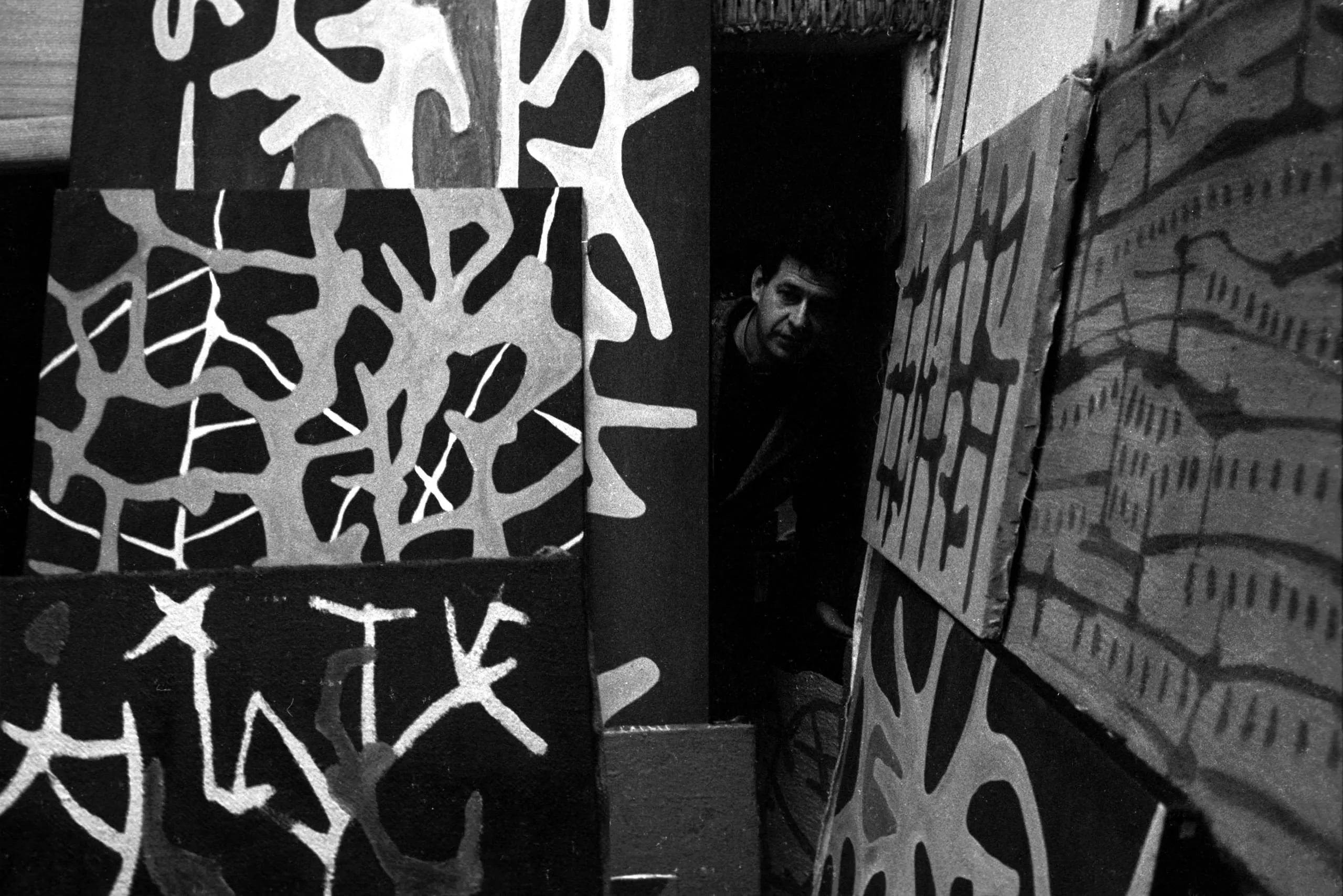 Black and white photograph of a man peering through a narrow doorway, flanked by large canvases painted with branching organic forms on dark grounds