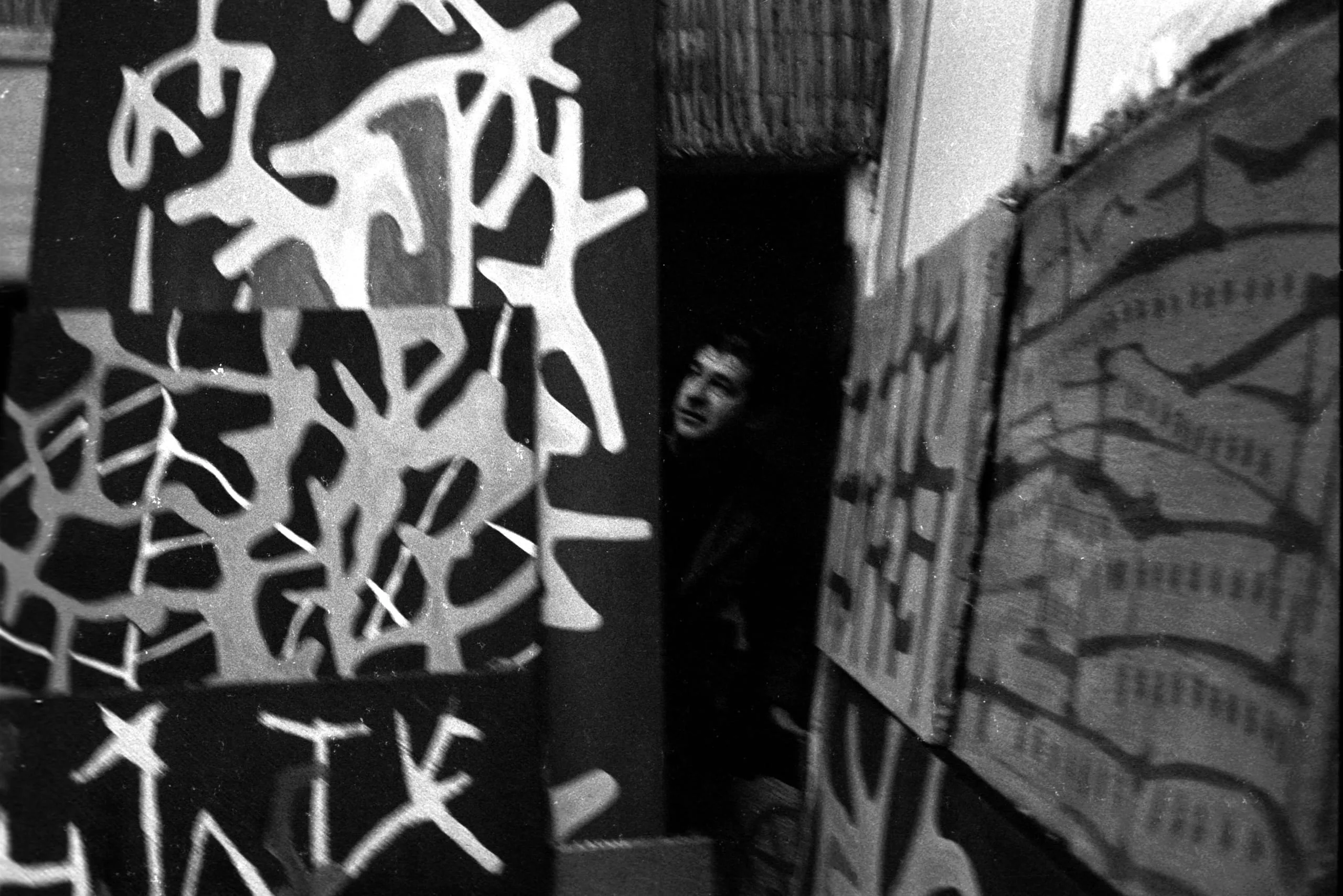 Black and white photograph of large abstract canvases leaning in a narrow passageway, with a figure partially visible in the shadowed gap between them