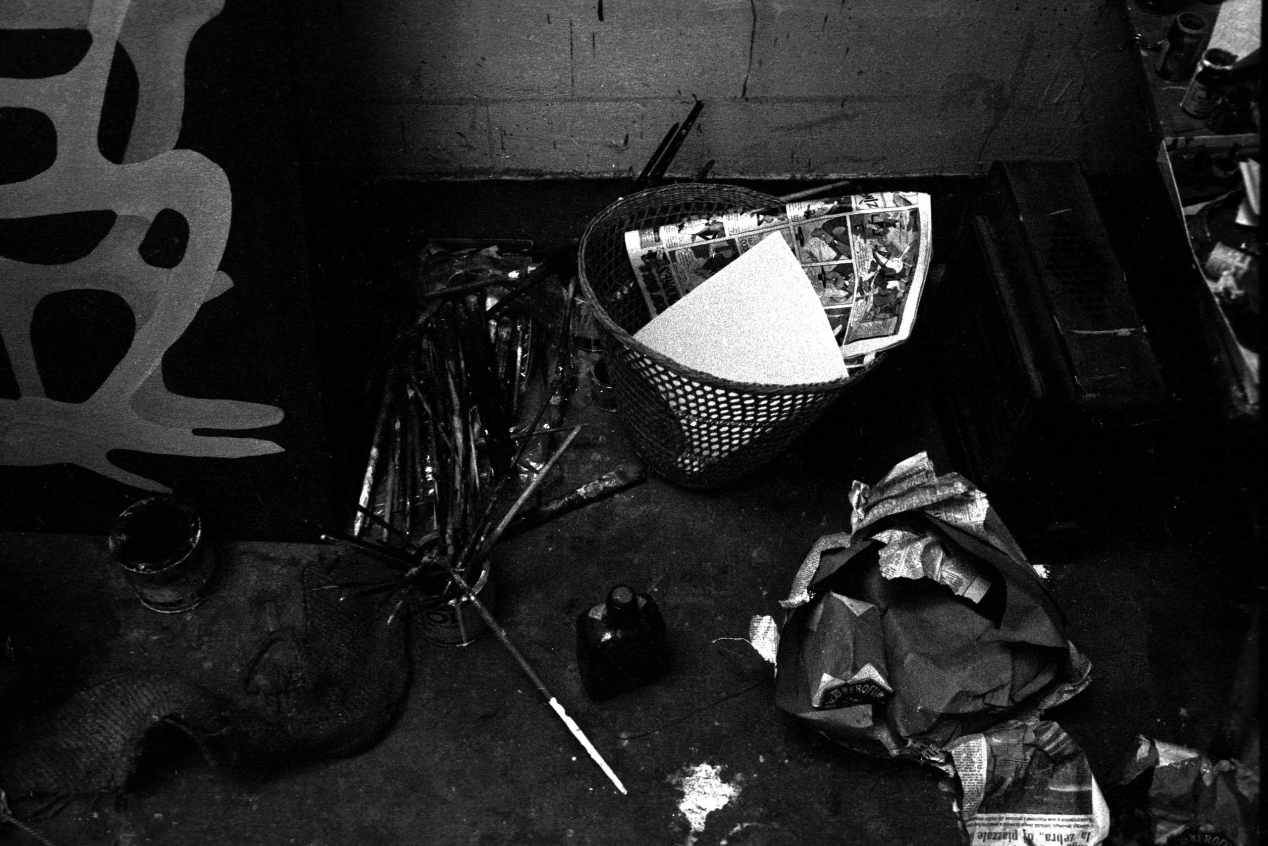High-contrast black and white photograph looking down onto a cluttered studio floor with a wire basket filled with papers, tangled brushes, crumpled newspaper, and a painted mural visible along the left edge
