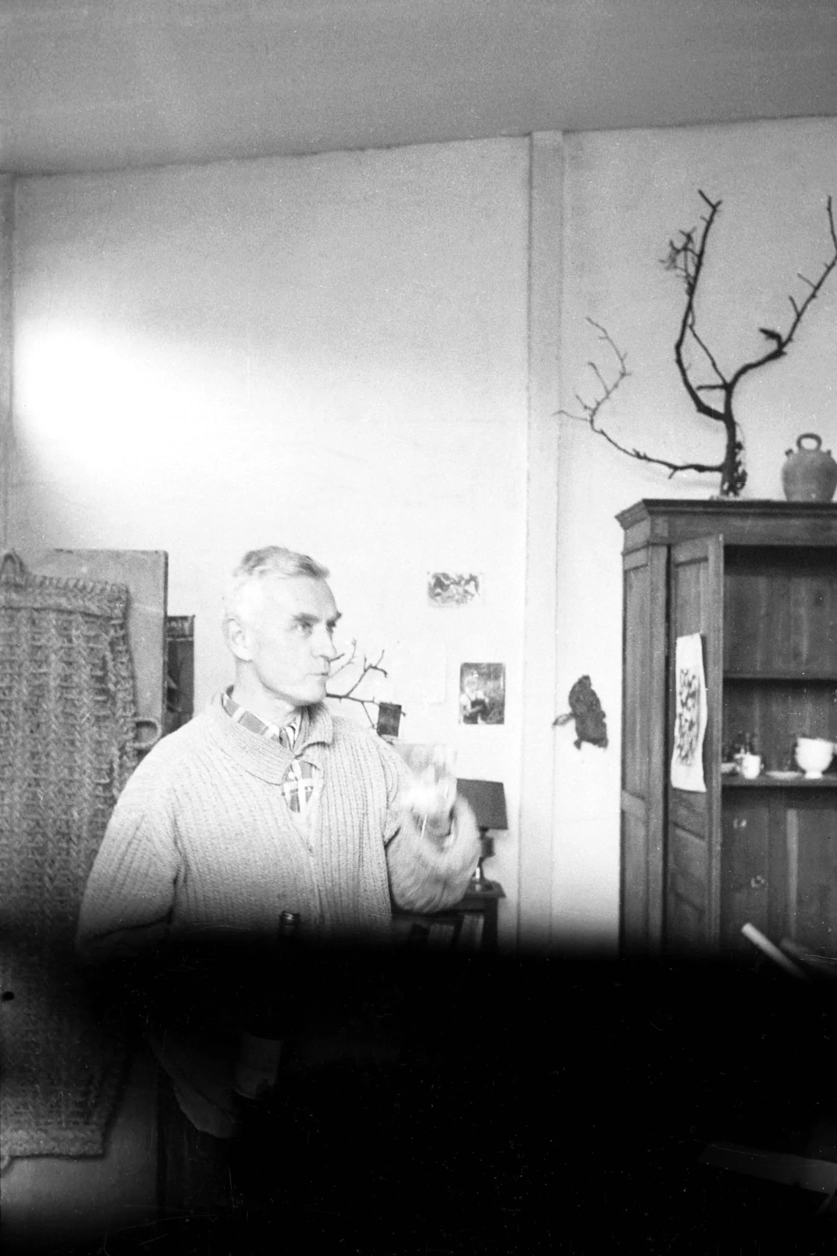 Black and white photograph of a white man in a cable-knit sweater standing in a furnished room, slightly out of focus, hand raised mid-gesture