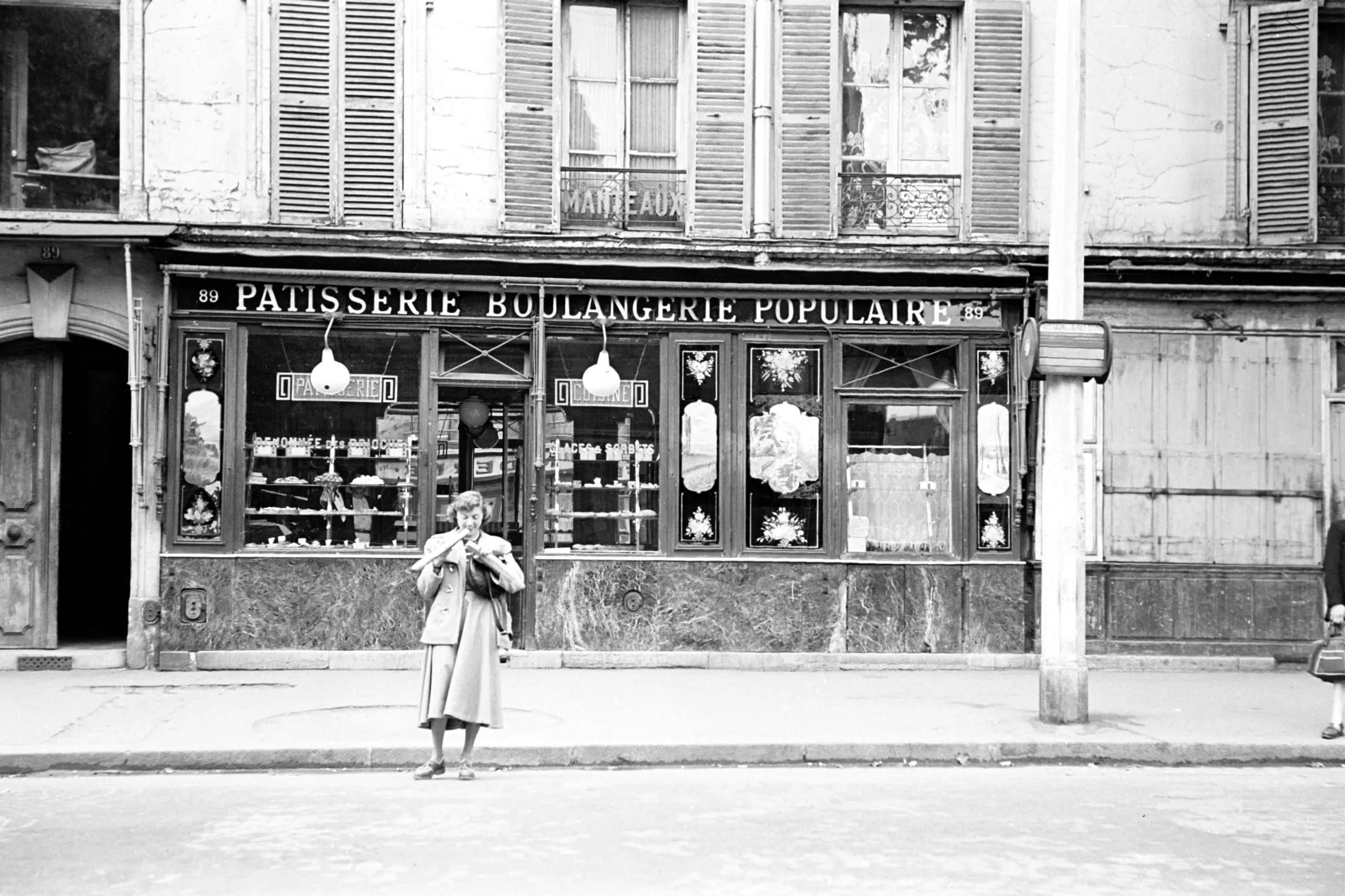 Black and white photograph of a woman in a belted coat standing on a Paris sidewalk in front of a patisserie and boulangerie storefront