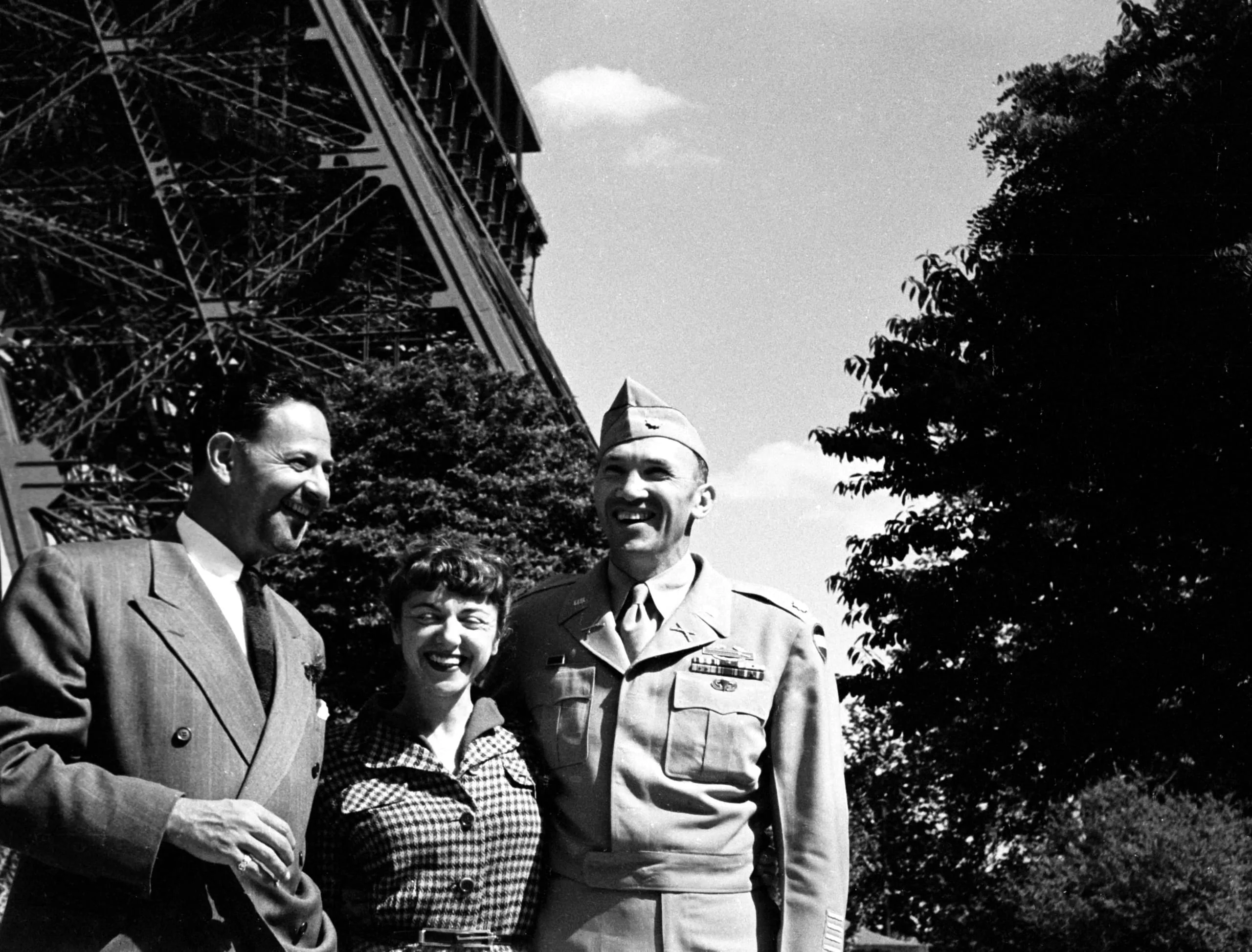 Black and white photograph of three people standing outdoors near the Eiffel Tower, including a man in a military uniform with medals