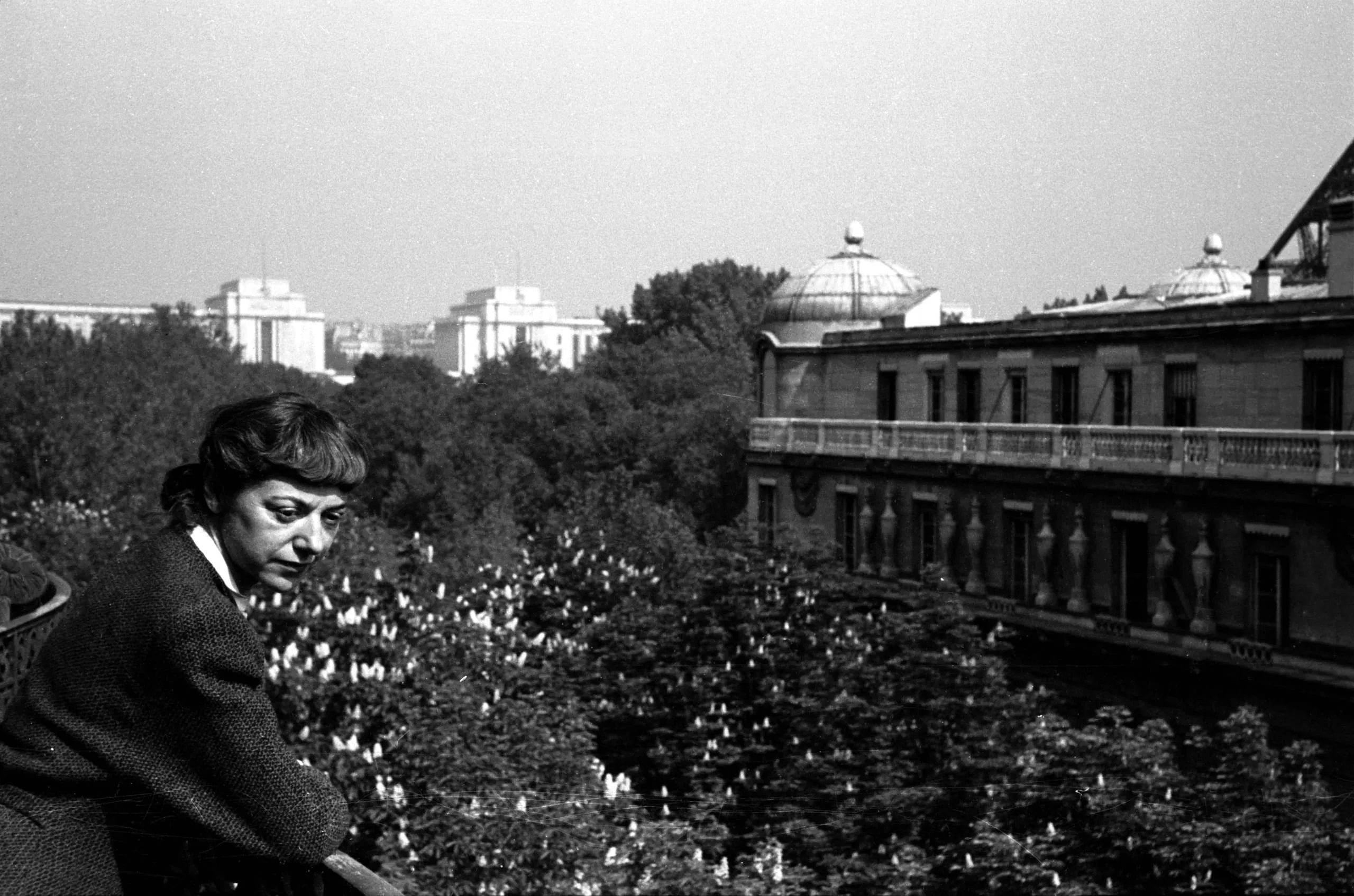 Black and white photograph of a woman with short dark hair leaning over a railing, with a tree-filled cityscape and neoclassical building behind her