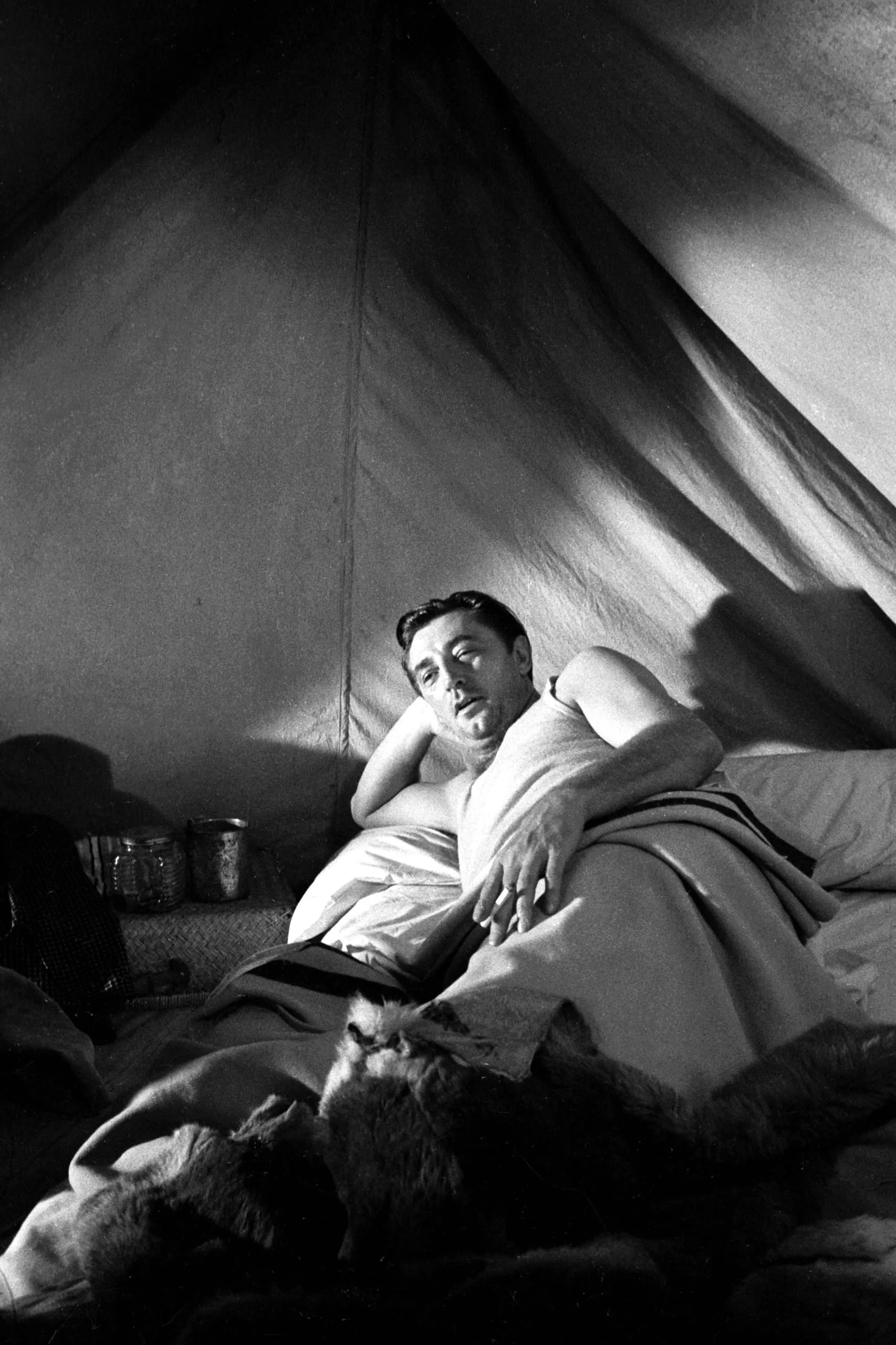 Black and white photograph of a bare-shouldered white man reclining in a canvas tent, lit by strong directional light from above right, with fur or pelts at the foot of the bed