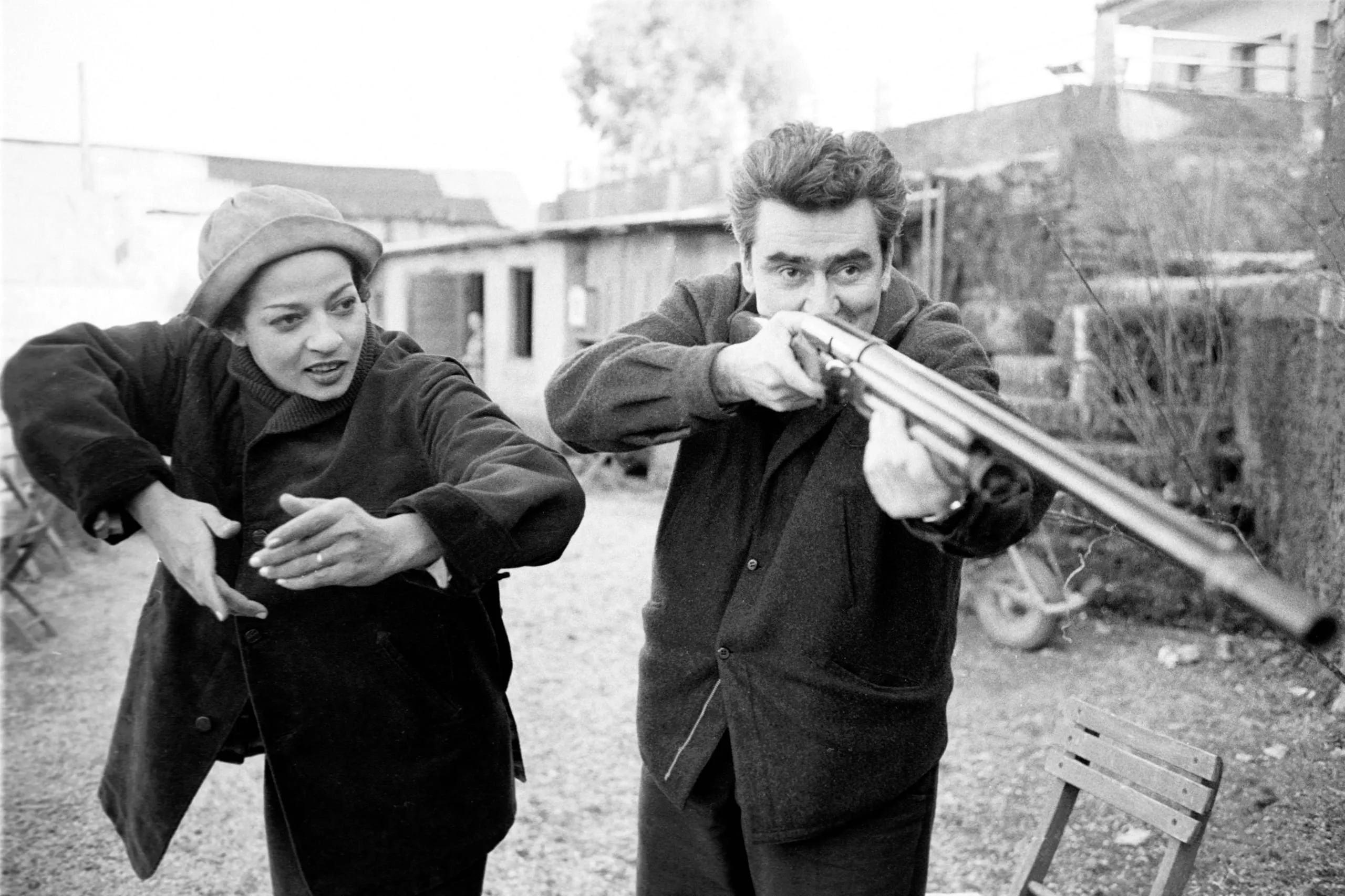 Black and white photograph of a man aiming a long-barreled gun to the right while a woman in a beret reaches toward it with open hands, outdoors