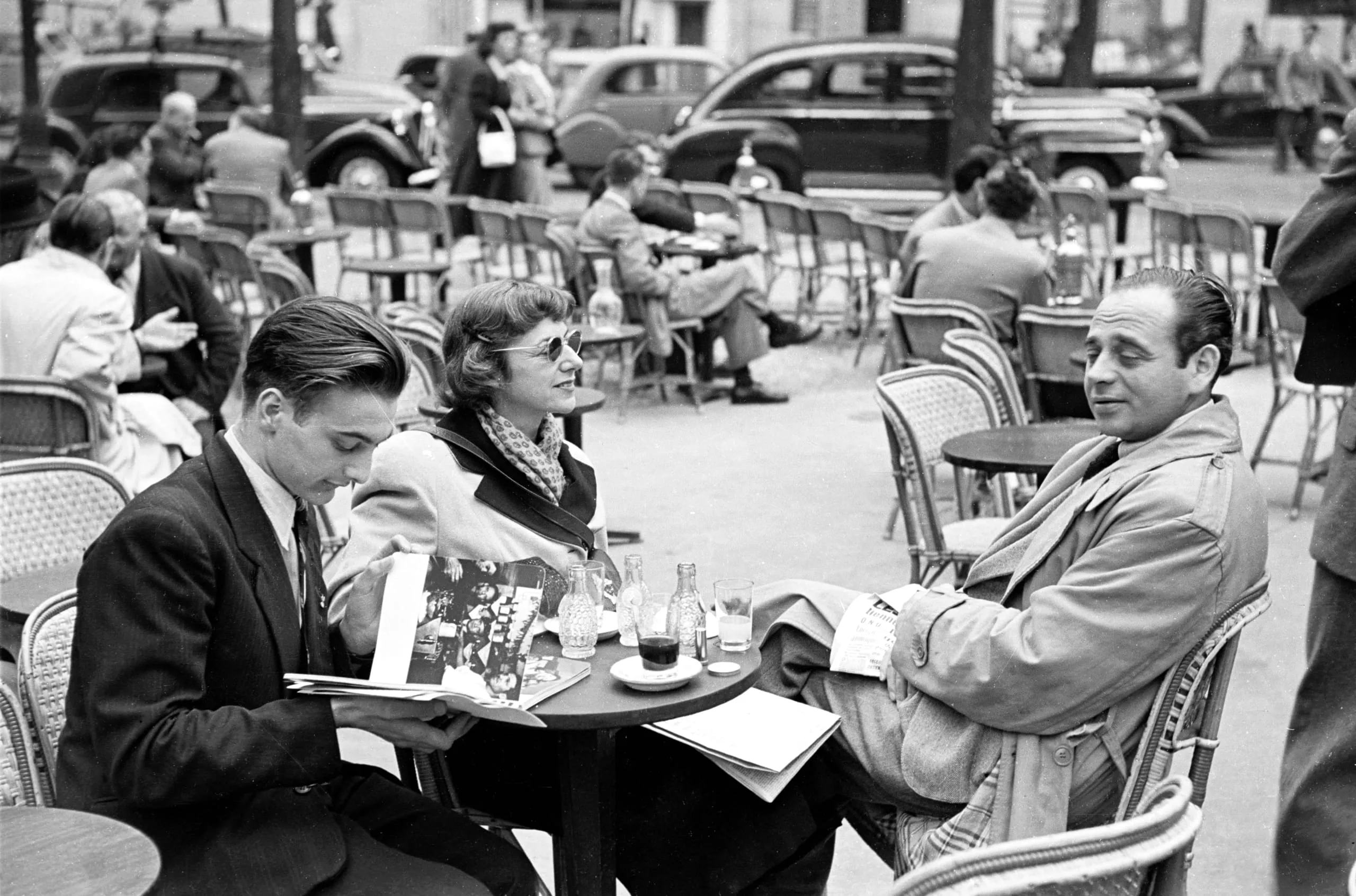 Black and white photograph of three people seated at an outdoor café terrace, with parked cars and other patrons visible in the distance