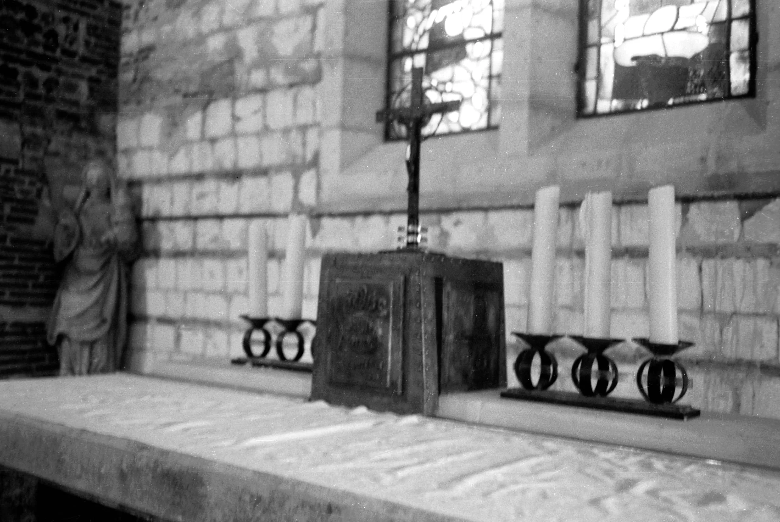 Black and white photograph of a stone church altar with a crucifix, dark wooden box, and metal candelabras holding white candles, stained glass windows in the background