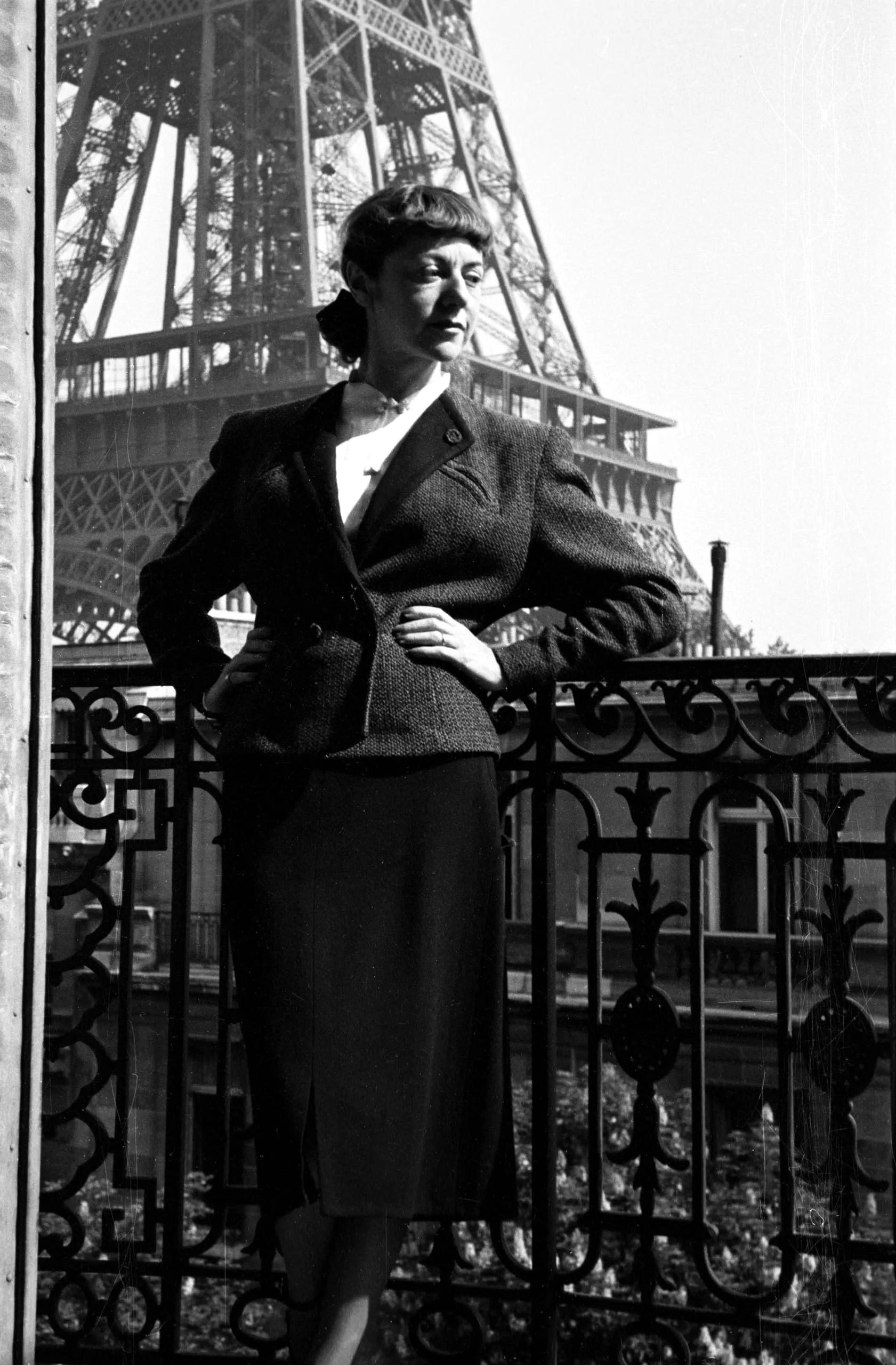 Black and white photograph of a woman in a fitted dark suit standing on a balcony with the Eiffel Tower rising behind her