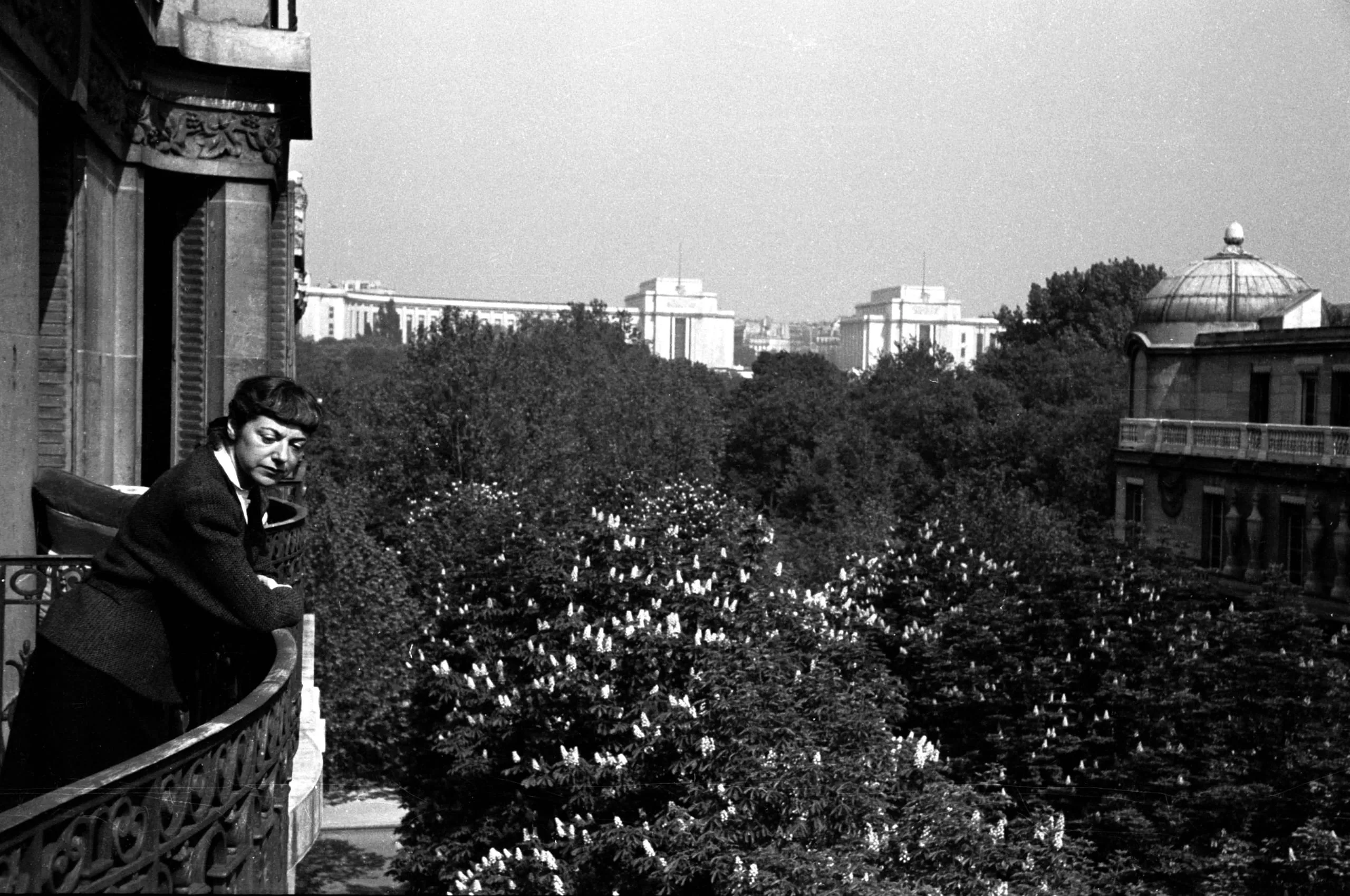 Black and white photograph of a dark-haired figure in a jacket leaning over an ornate iron balcony railing, overlooking a canopy of flowering trees with a domed building and city skyline in the distance