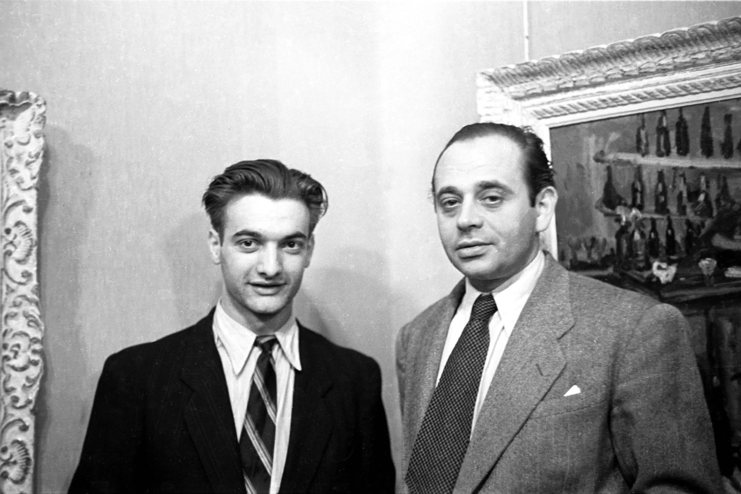 Black and white photograph of two men in suits and ties standing side by side, a framed painting of bottles visible on the wall behind them