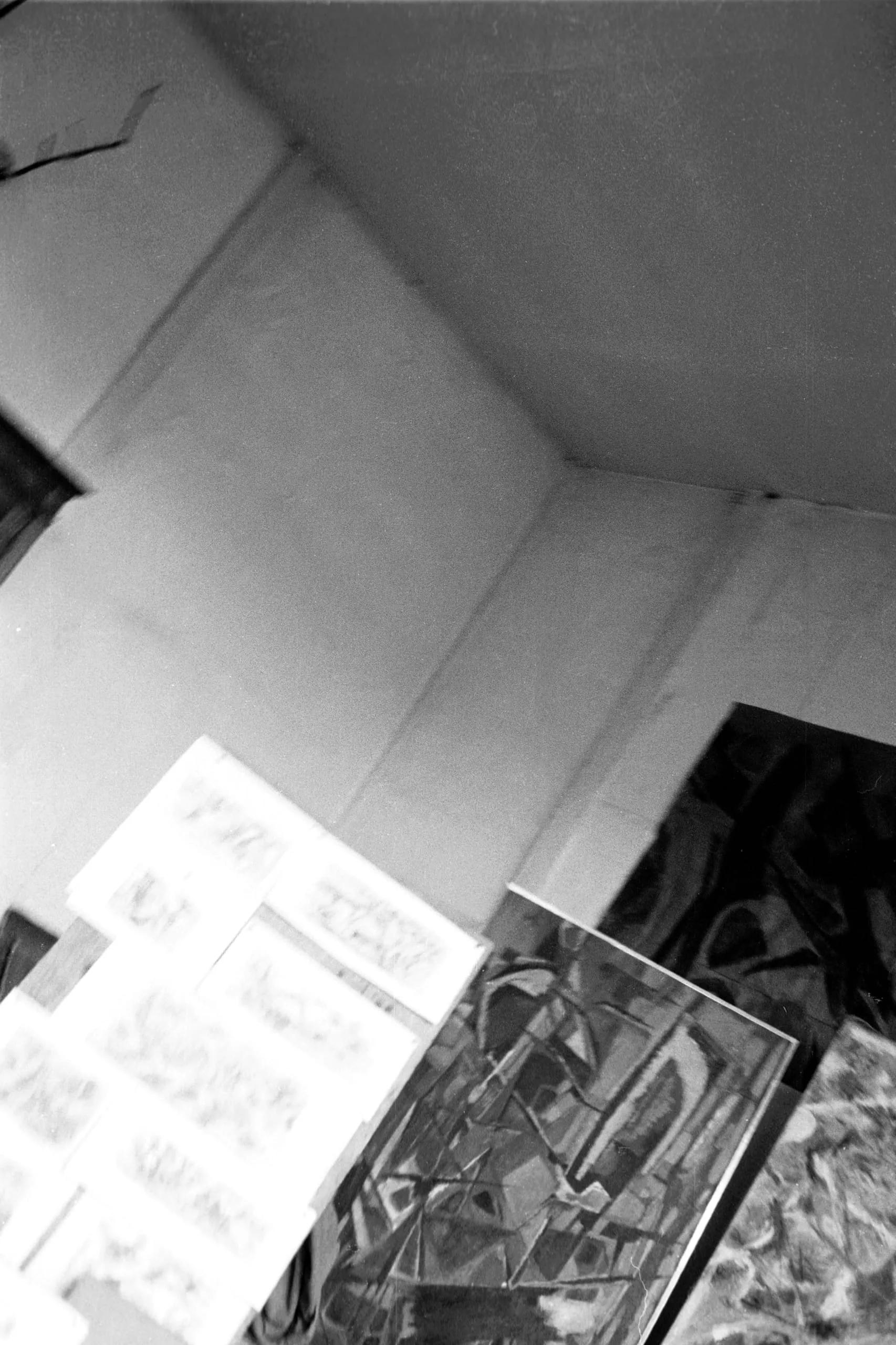 Black and white photograph of a room corner shot at a steep diagonal angle, with stacked artworks on the floor below, including a Cubist-style canvas