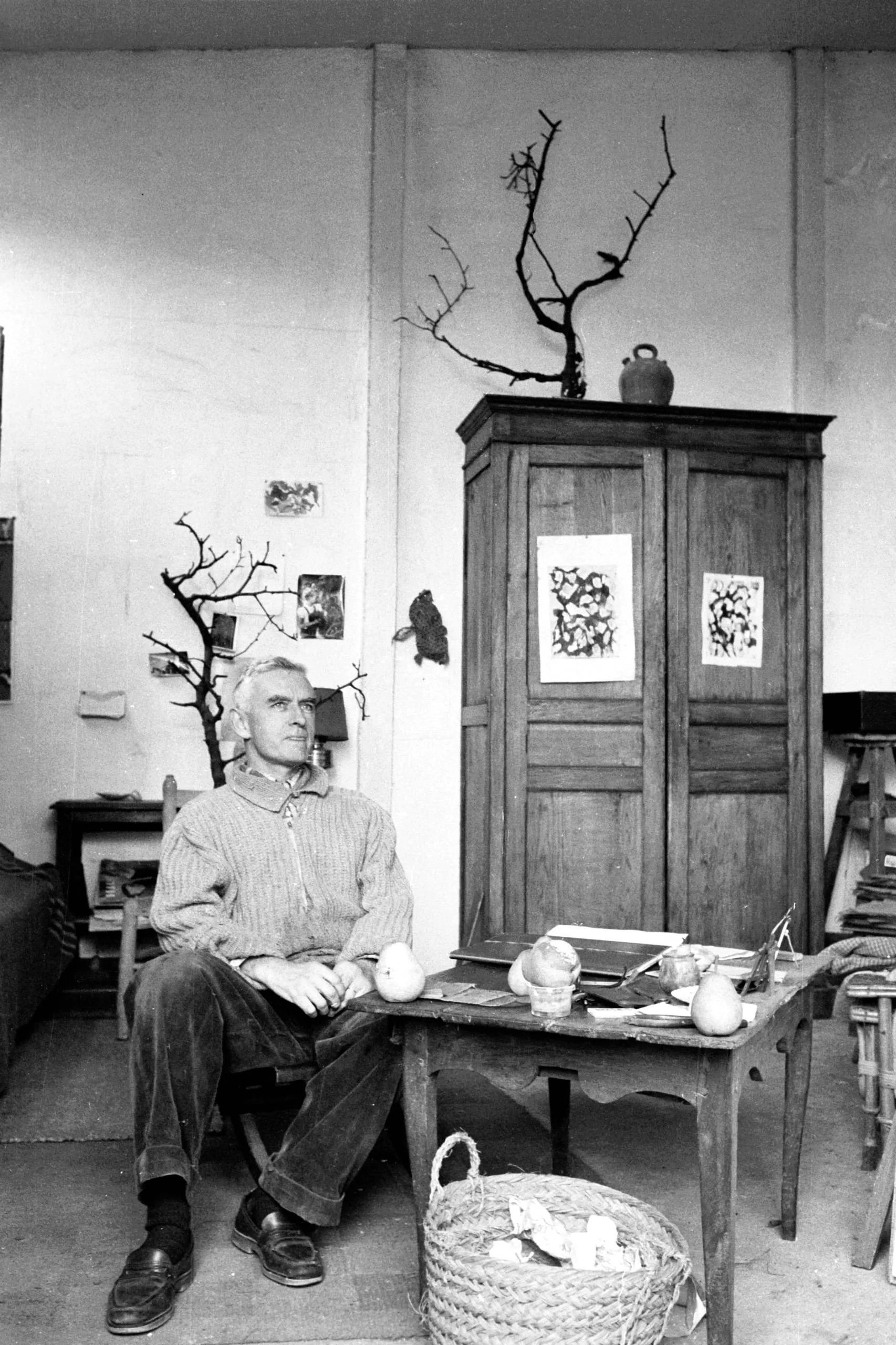 Black and white photograph of a man seated in an artist's studio, looking upward, surrounded by bare branches, a wooden armoire with pinned prints, and gourds on a worn table