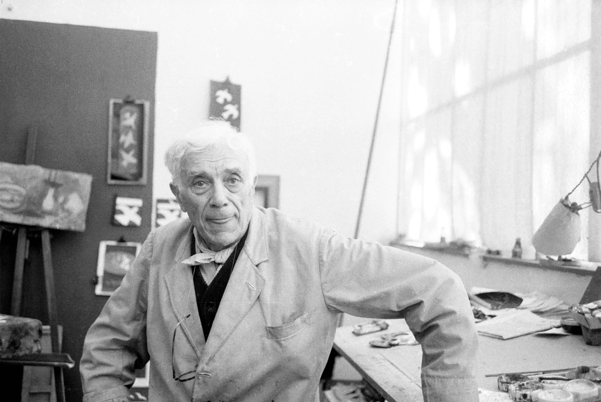 Black and white photograph of an elderly white-haired man in a light smock standing in an artist's studio, with paintings on the wall and a large window behind him