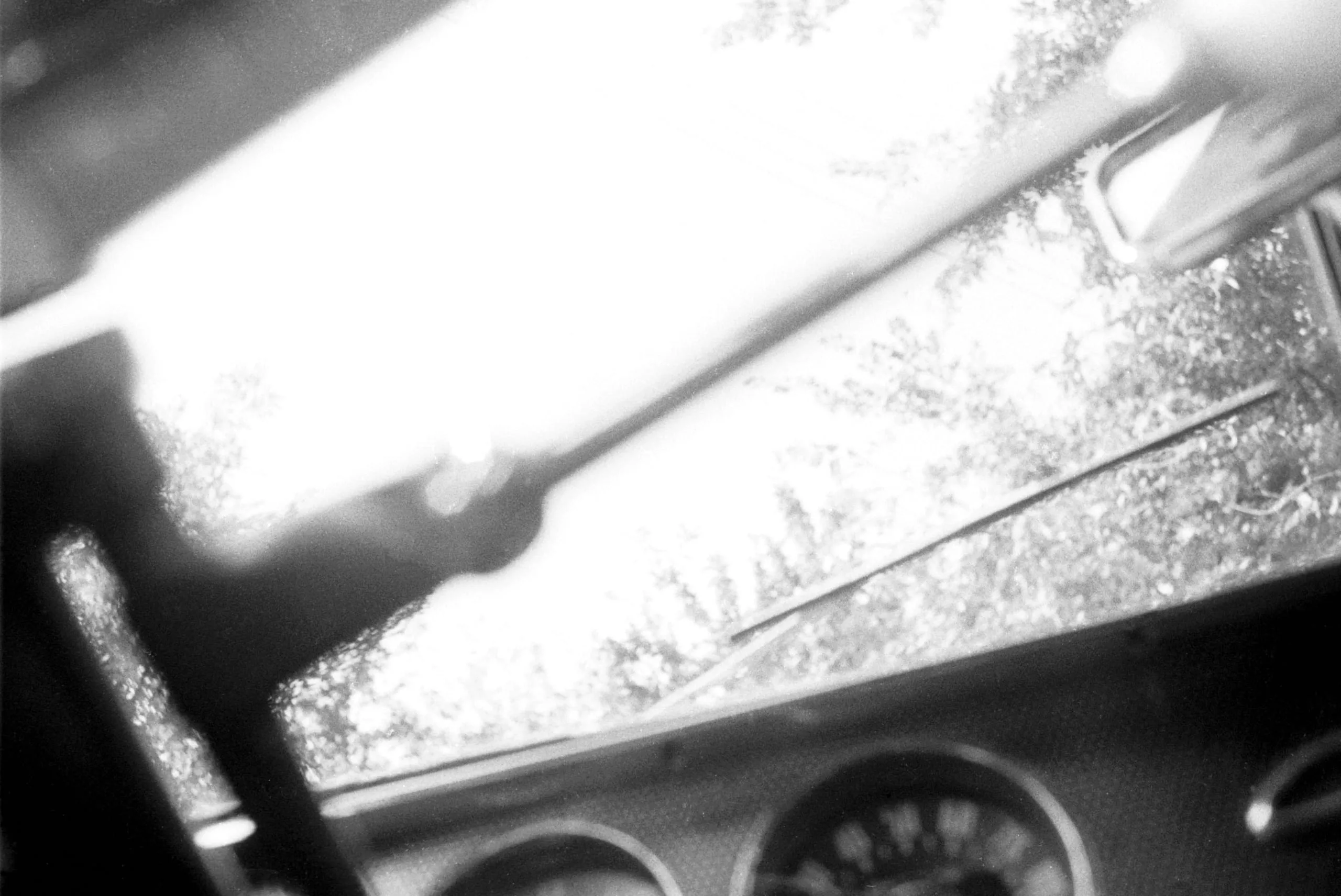 Black and white photograph taken from inside a car at a tilted angle, with heavy overexposure obscuring the windshield view, dashboard gauges visible in the lower corner