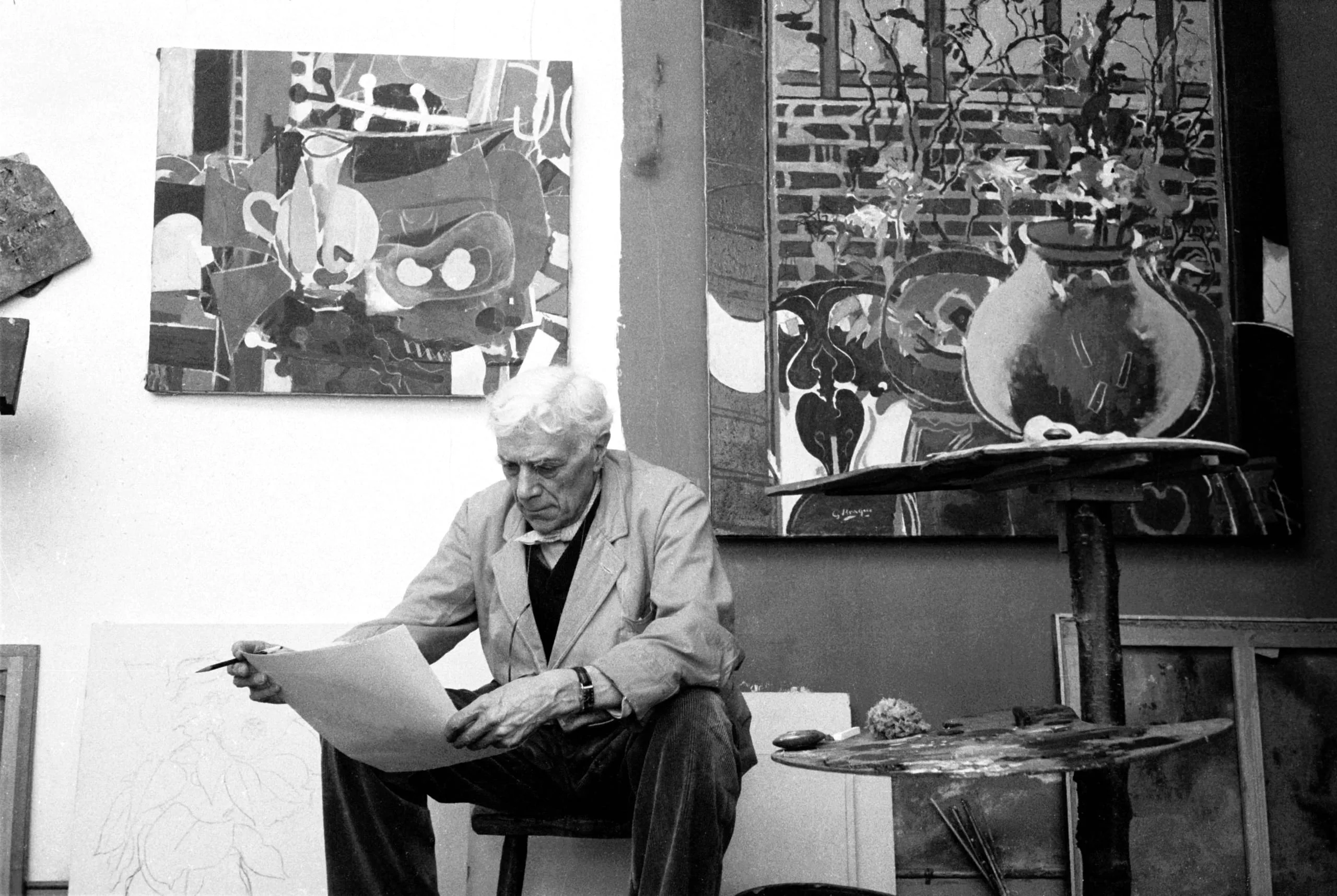 Black and white photograph of an elderly white-haired man seated in a studio, leaning forward to draw on a large sheet of paper, surrounded by large abstract paintings
