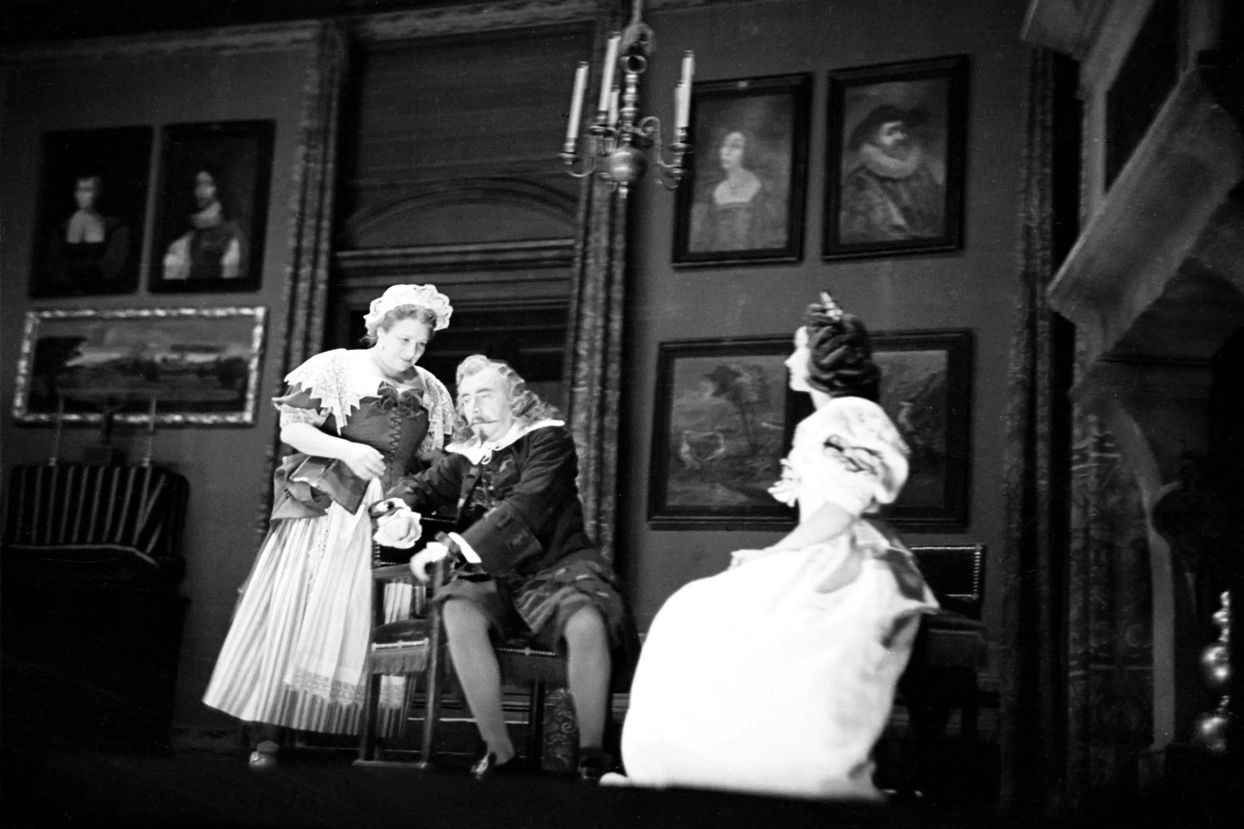 Black and white photograph of three costumed figures on a theatrical stage set with period portraits hanging on dark paneled walls