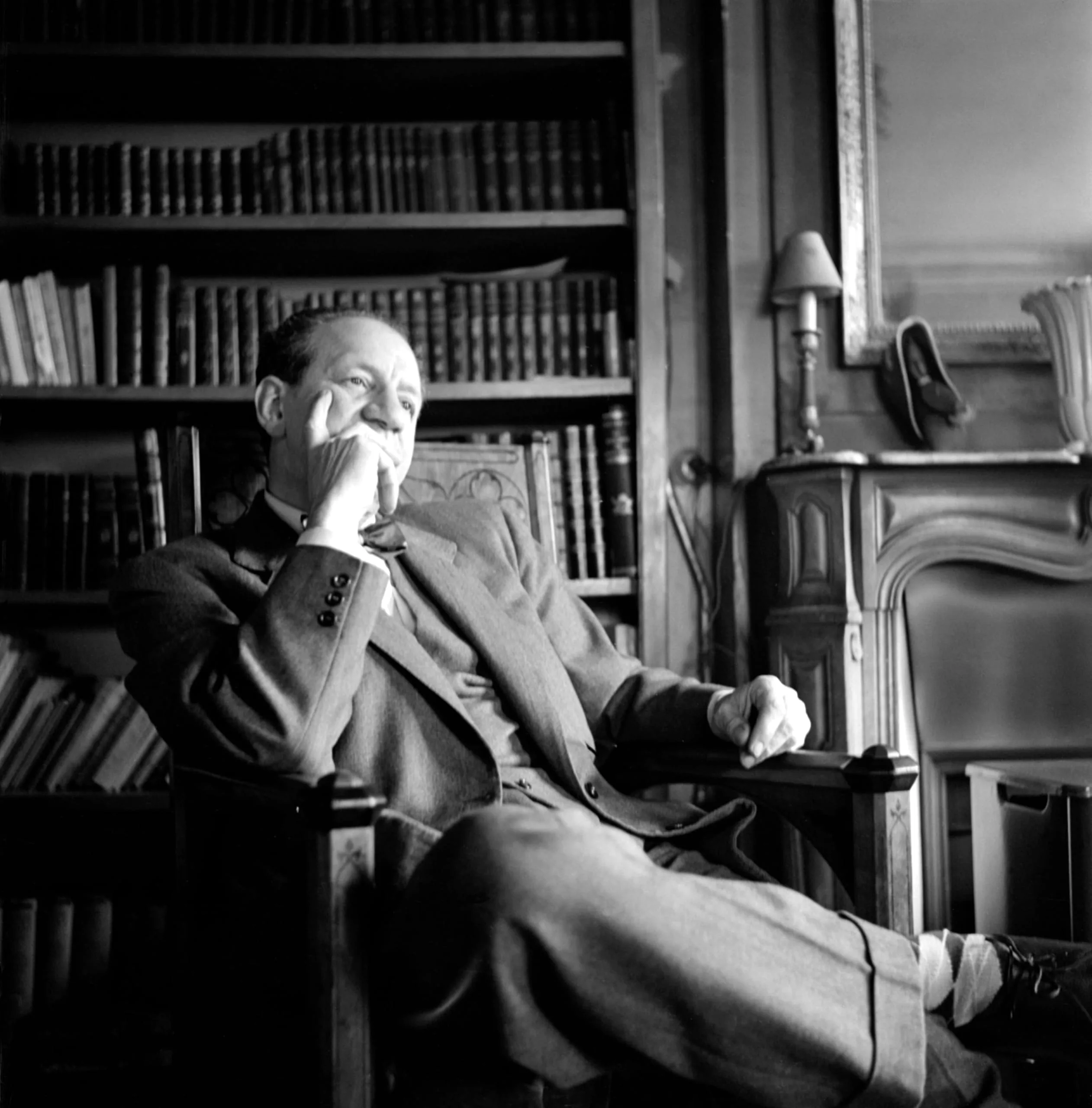 Black and white photograph of a man in a suit seated in a carved wooden chair, leaning his cheek on his raised hand, looking upward, with bookshelves behind him