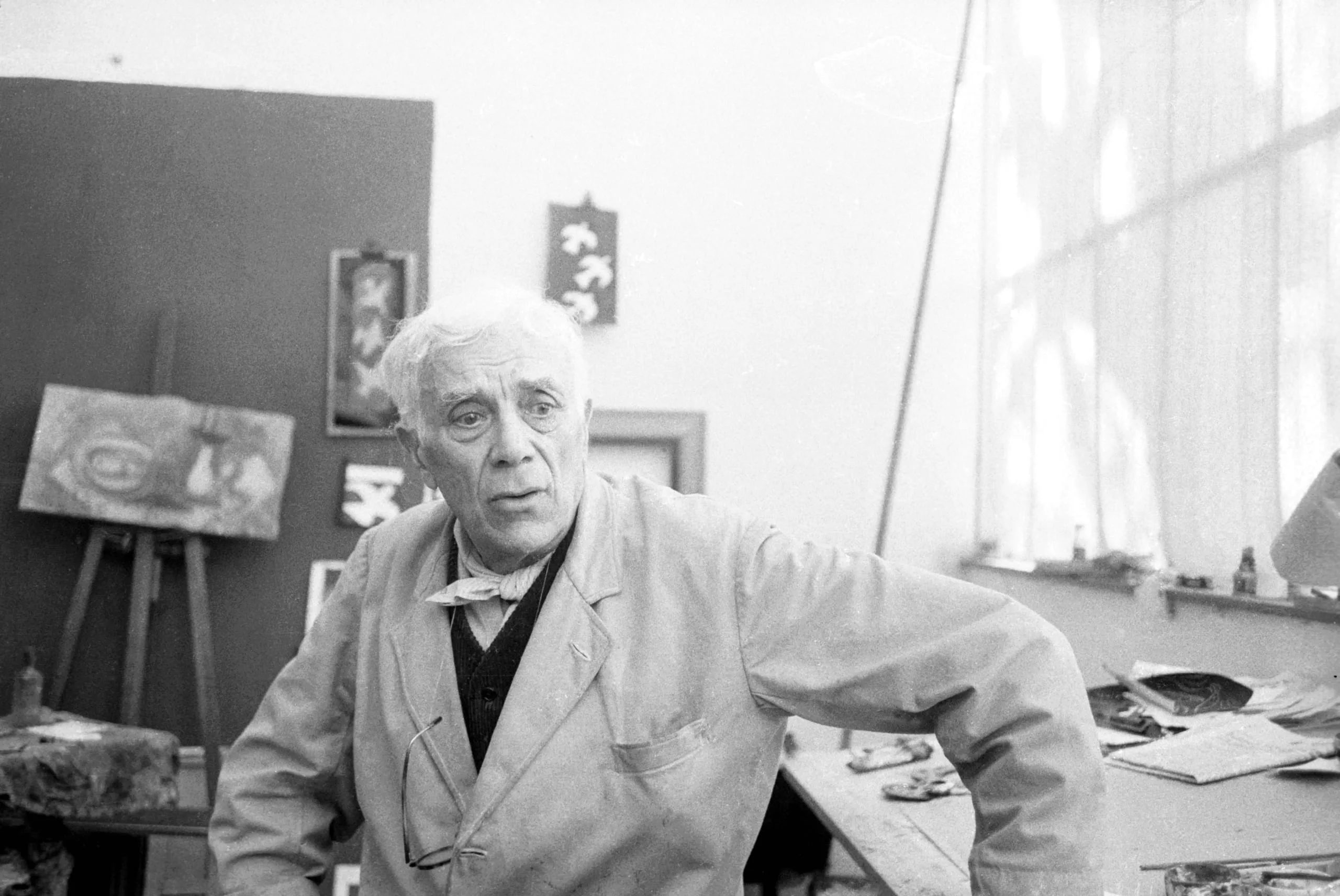 Black and white photograph of an older white man in a painter's smock standing in an art studio, with canvases and an easel visible behind him