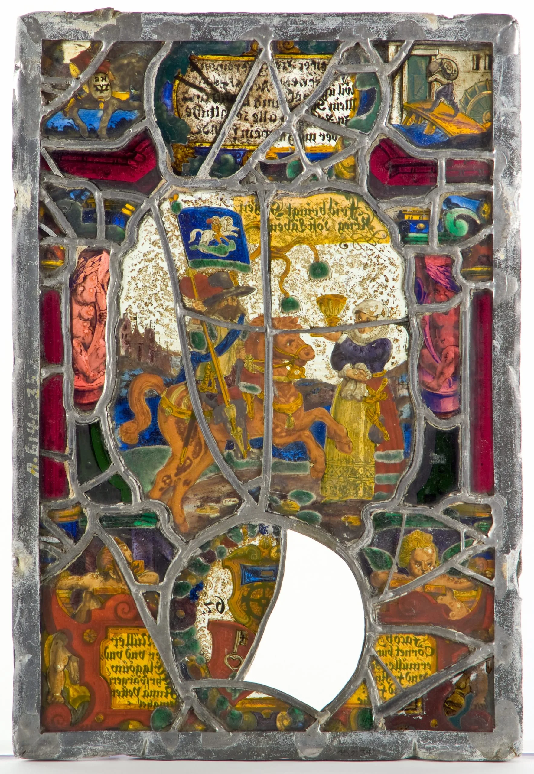 - Pot metal; white glass with silver stain and enamel