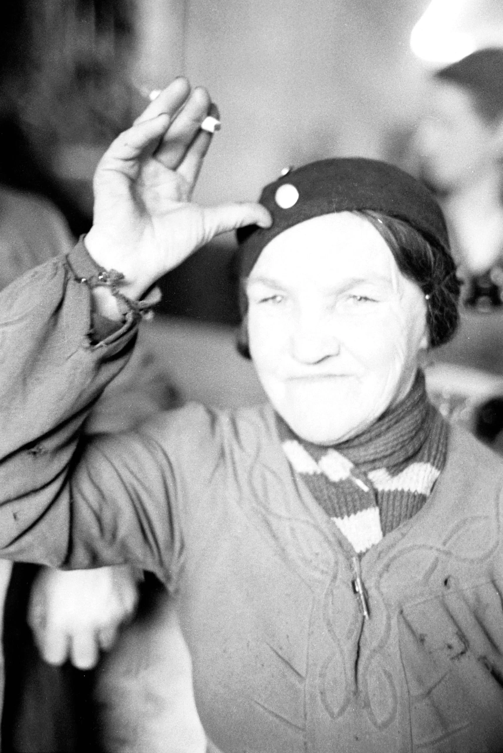 Black and white photograph, waist-up portrait of a middle-aged woman in a beret and striped scarf, right arm raised holding a cigarette