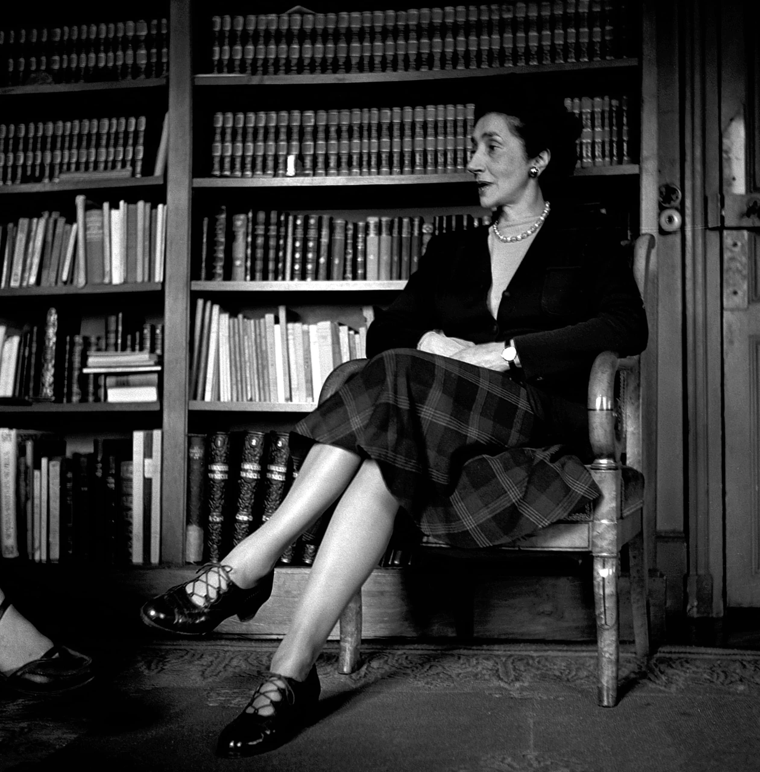 Black and white photograph of a woman in a tartan skirt and dark jacket seated in a wooden armchair in front of a floor-to-ceiling bookcase, shown in full-length profile