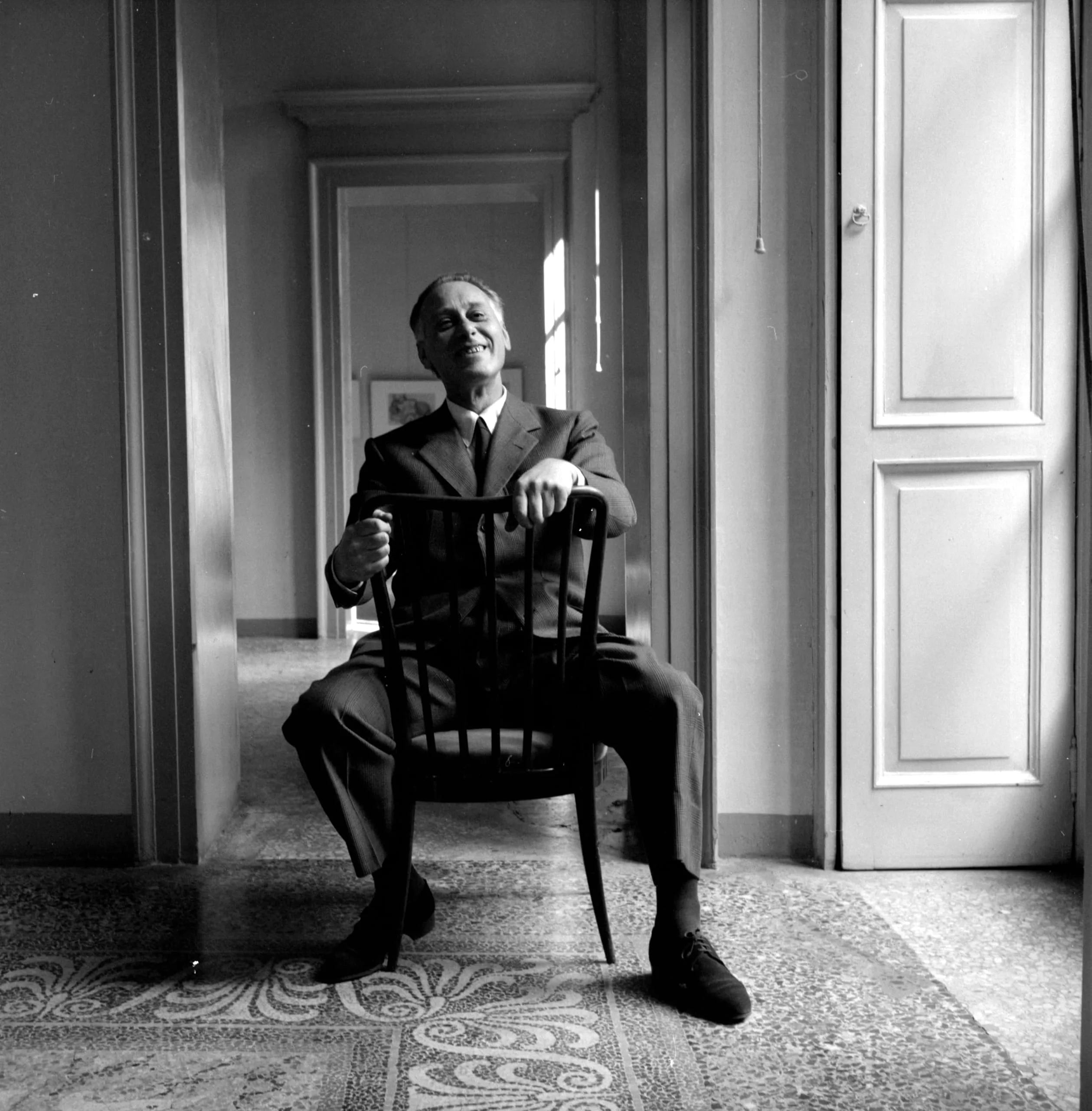 Black and white photograph of a white man in a dark suit seated backward on a spindle-back chair in a long interior corridor, head tilted back, mouth open wide