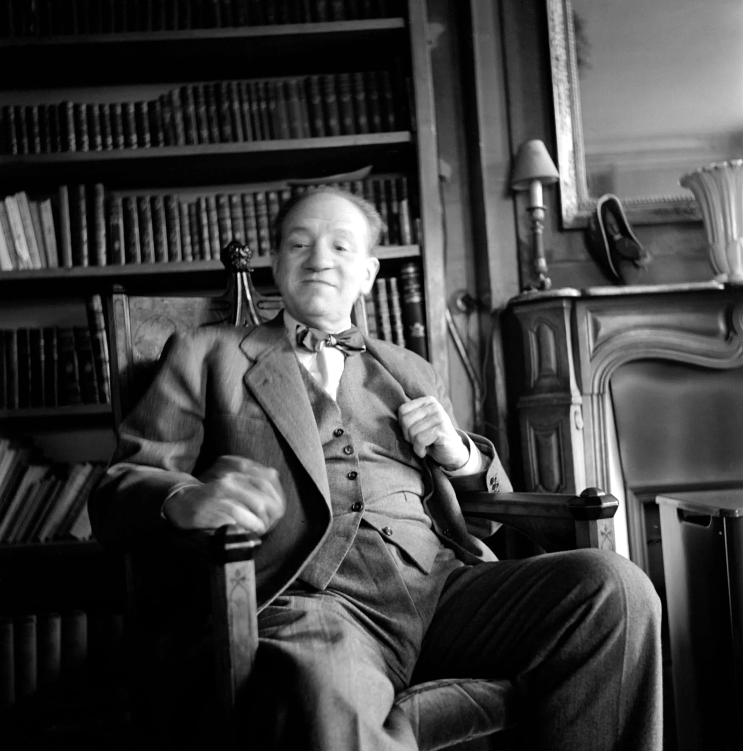 Black and white photograph of a heavyset man in a three-piece tweed suit and bow tie, seated in a wooden armchair before shelves of books