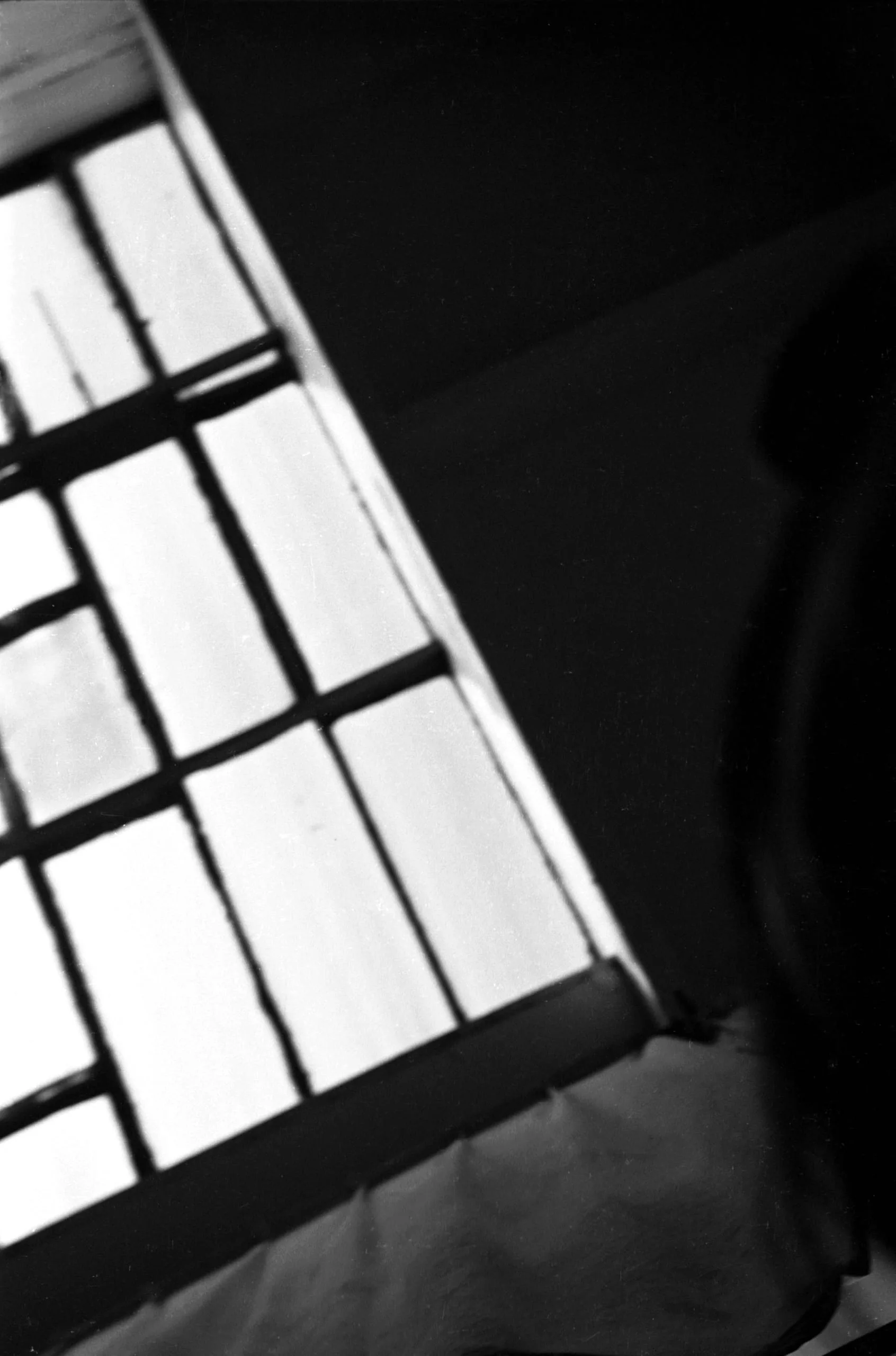 High-contrast black and white photograph, tilted diagonal composition with a multi-paned window glowing white against deep black walls, partial dark form along right edge