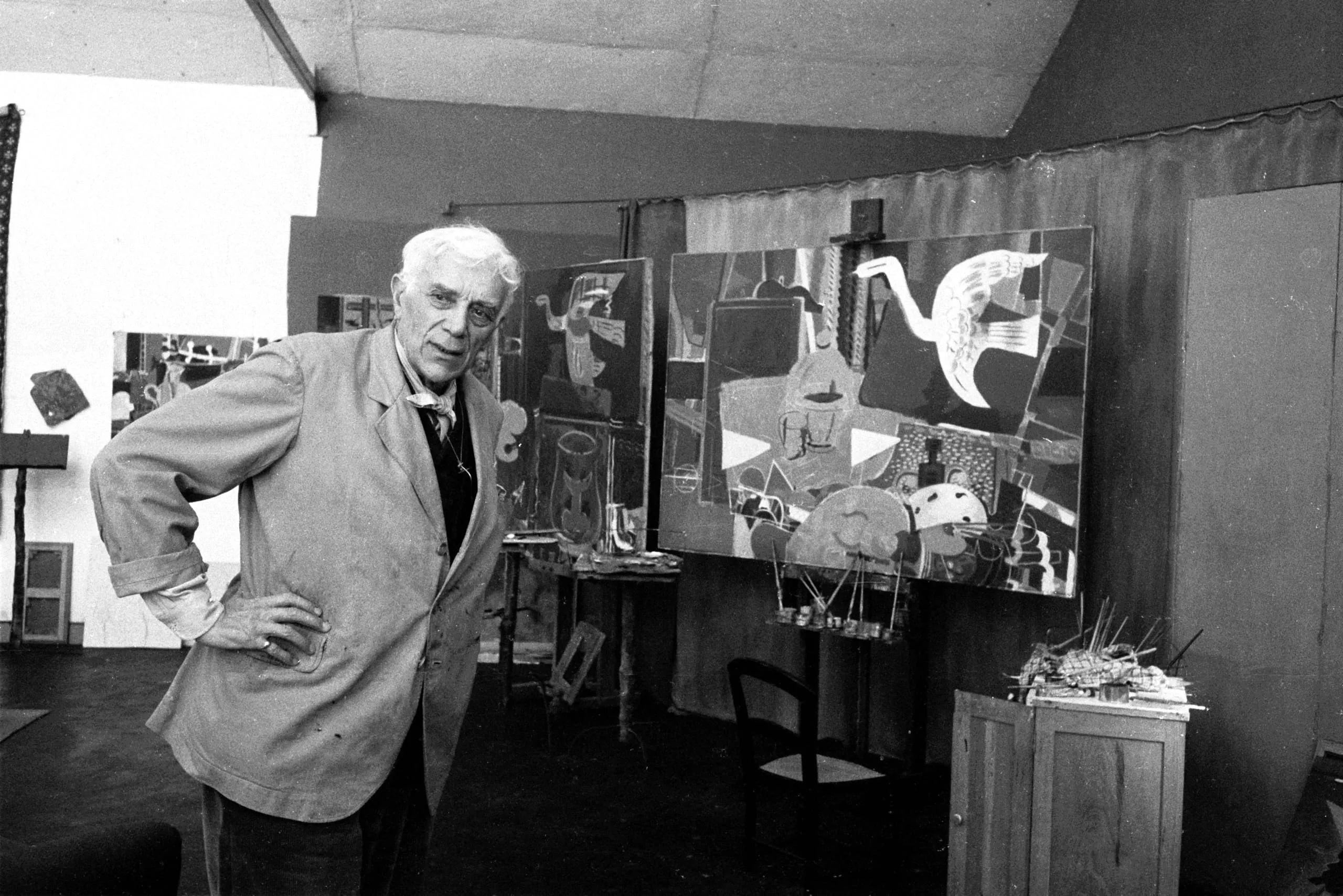 Black and white photograph of a white-haired man in a work coat standing in an artist's studio beside two large semi-abstract paintings on an easel