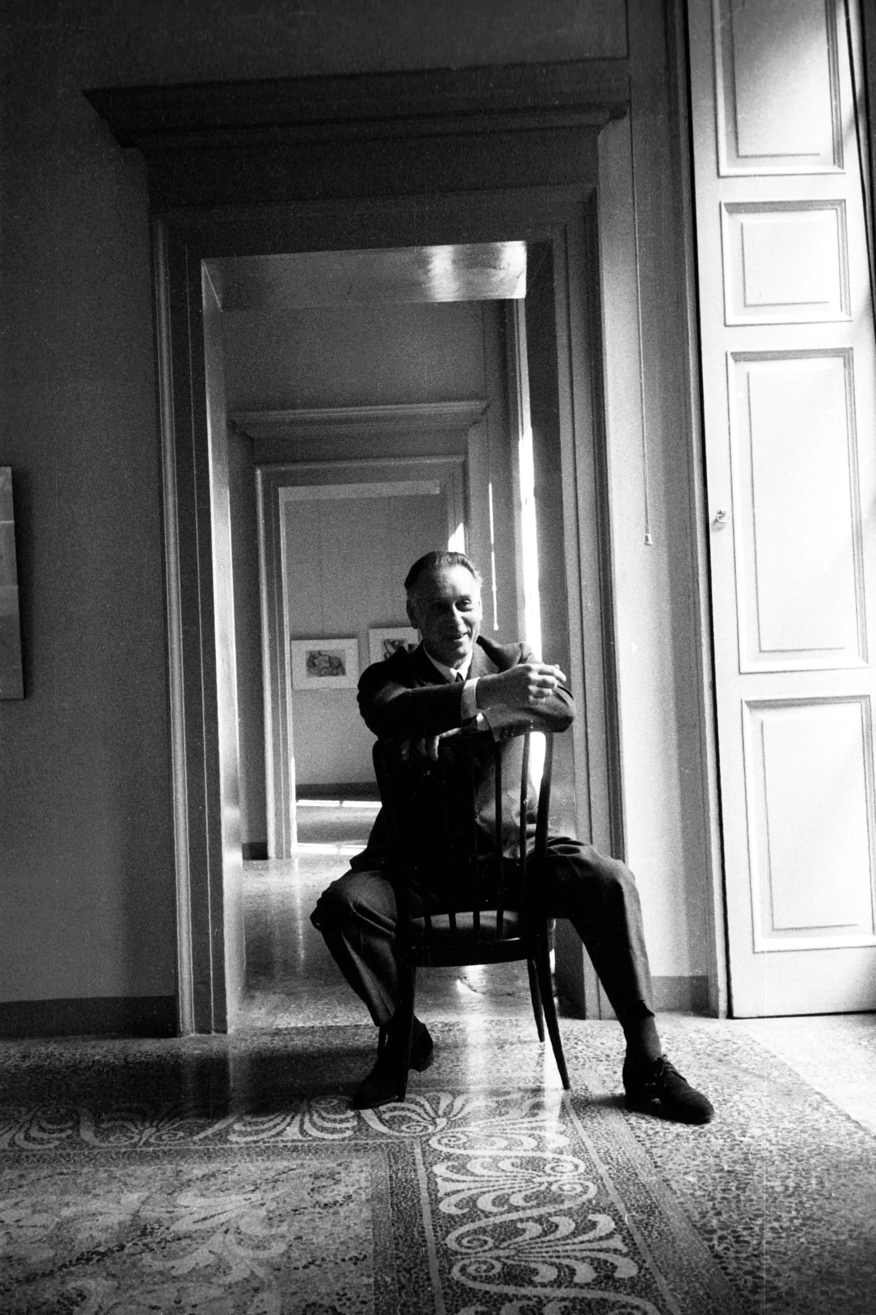 Black and white photograph, a man in a dark suit seated backward on a wooden chair in a doorway, leaning forward with arms folded over the chair back, smiling, ornate tiled floor in the foreground
