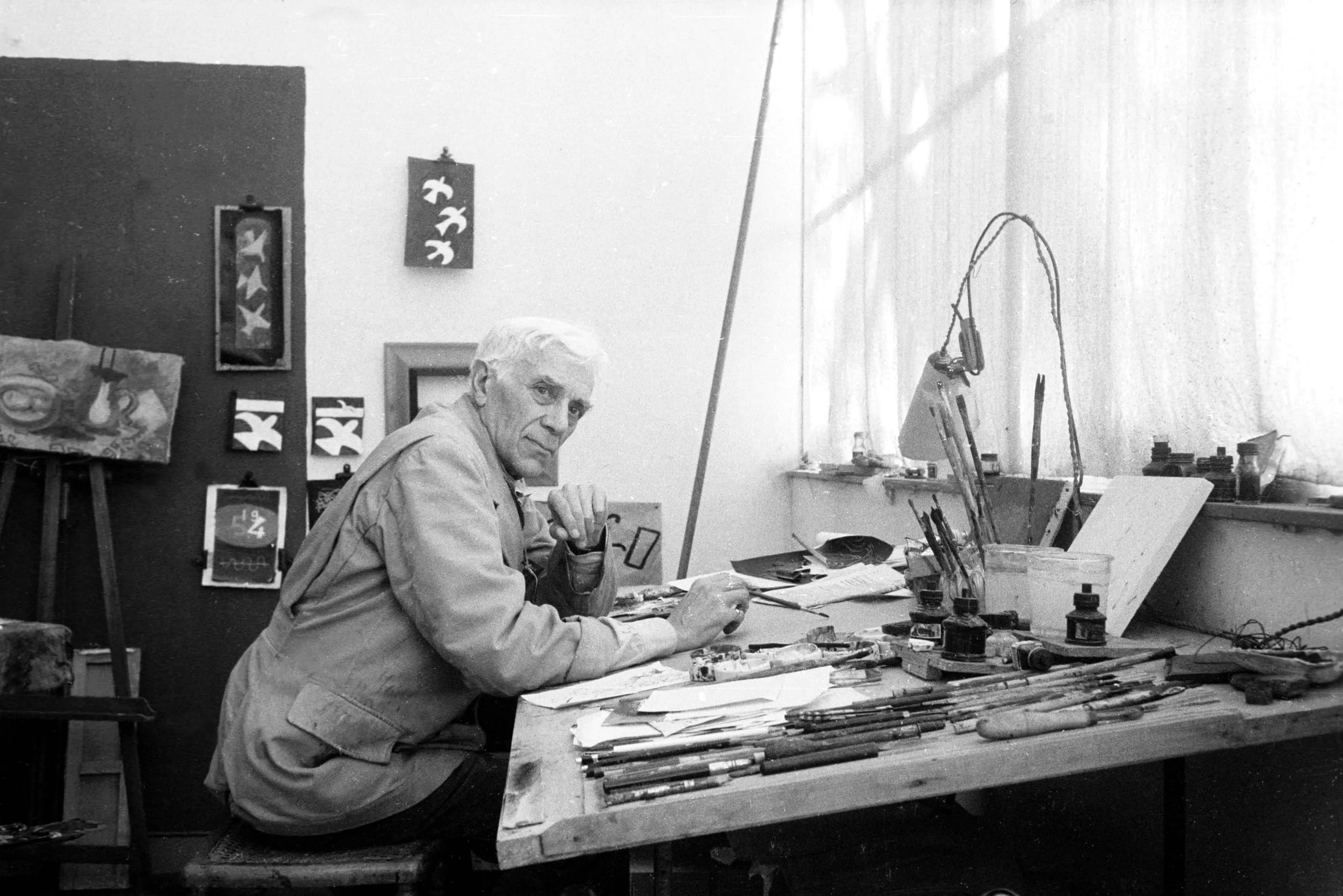Black and white photograph of an elderly white man in a work smock seated at a tool-covered studio worktable, turning to look at the camera