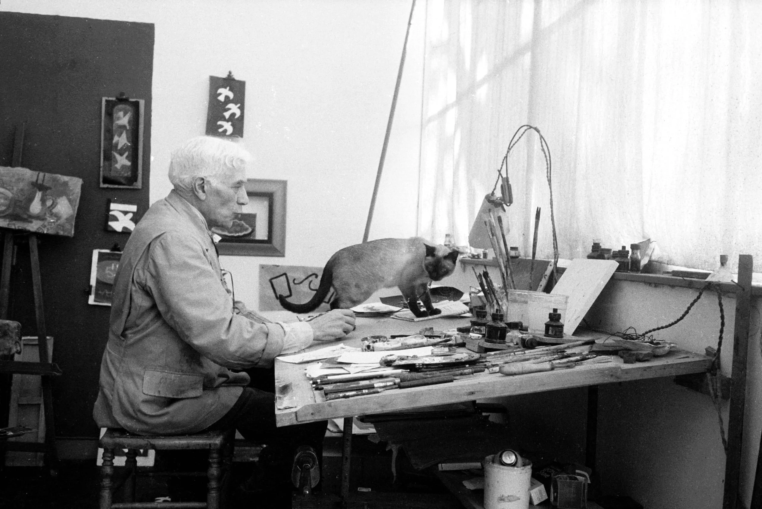 Black and white photograph of an elderly white-haired man in a work smock seated in profile at a cluttered artist's worktable, with a Siamese cat standing beside him