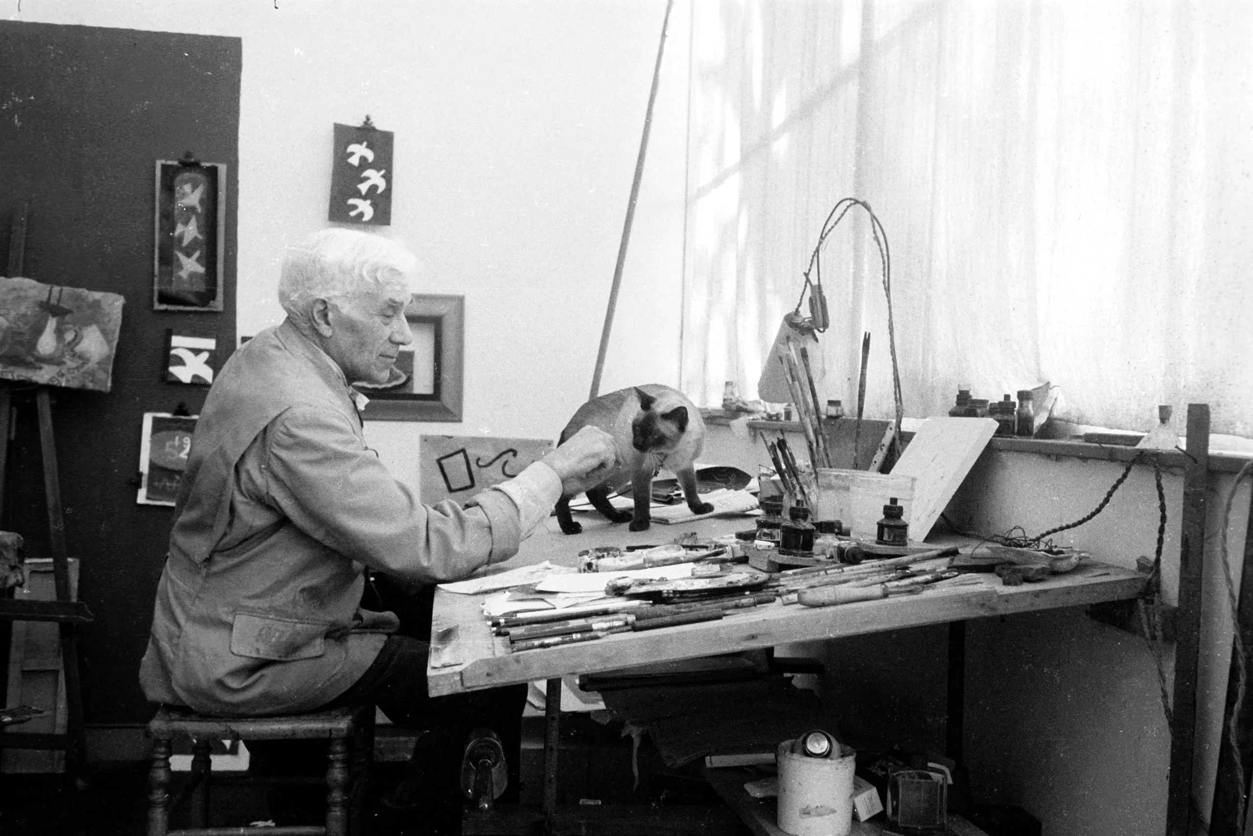 Black and white photograph of a white-haired man in a work smock seated in profile at a cluttered studio worktable, reaching toward a Siamese cat
