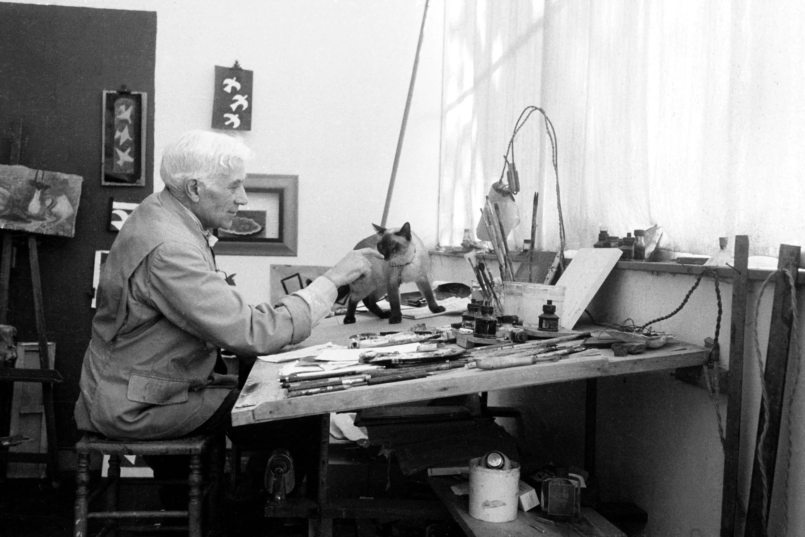 Black and white photograph of an elderly white-haired man in a work jacket sitting in profile at a cluttered artist's worktable, reaching toward a dark cat standing on the table, studio artworks visible in the background