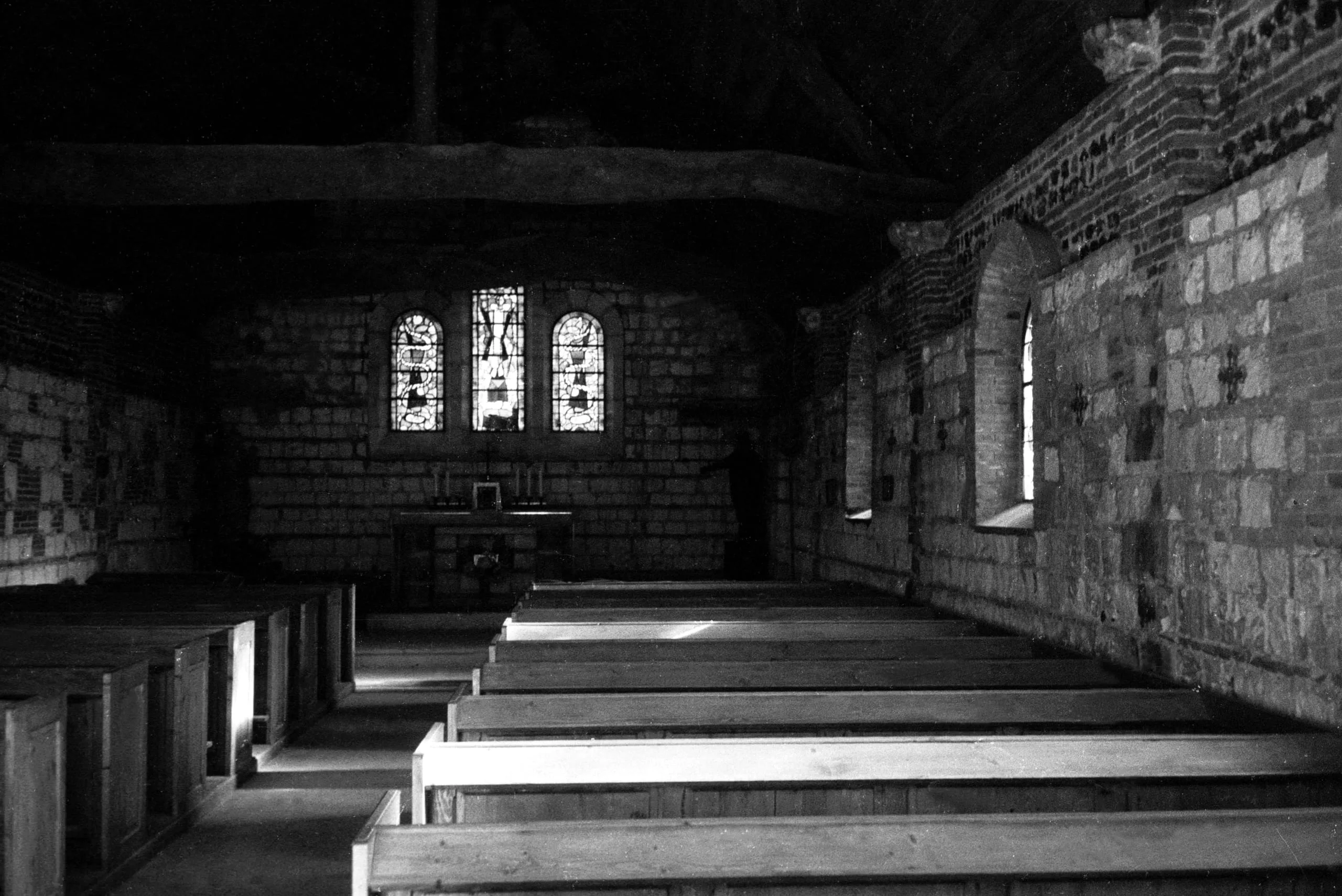 Black and white photograph of a small stone church interior, looking down a central aisle flanked by wooden pews toward a stained glass window above a modest altar