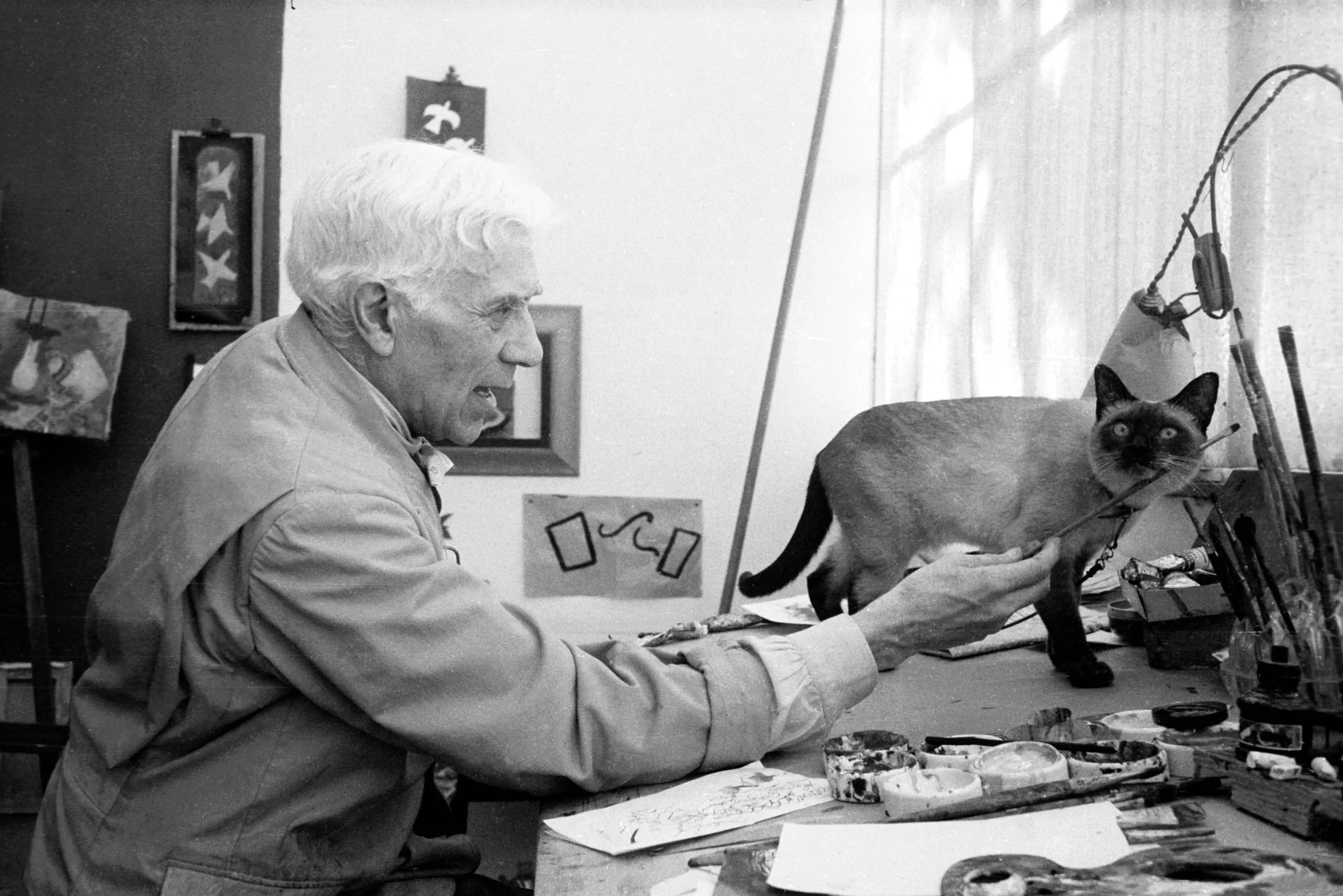 Black and white photograph of an older white-haired man in profile at an artist's worktable, reaching toward a Siamese cat standing among paint supplies, with artworks visible on the studio walls behind him